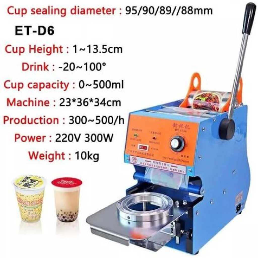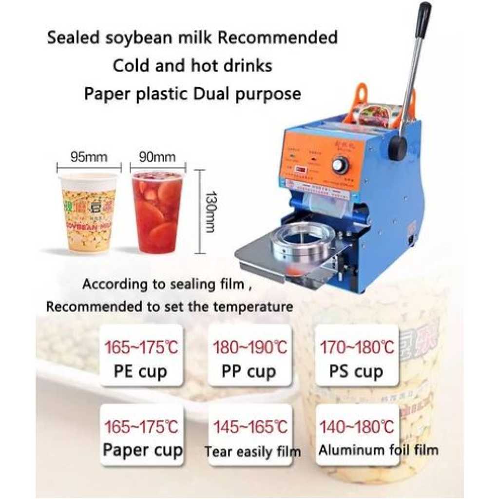Key Features: Material: Made Of Alloy + Aluminum, The Stable Structure Provides Commercial Quality Reliability, Corrosion Resistance, Rust Resistance, Acid And Alkali Resistance. Strong And Sturdy Adjustable Cup Sealing Temperature: 0-250°C/0-482°F Temperature Adjustment Range Easy To Use: The Cup Sealer Is Manual And Than Automatic Cup Sealers. Small Size. It’S Easy To Move, Doesn’T Take Up Much Space, And Is Affordable. Just Push The Handle And Seal 300-500 Cups Per Hour Feature Introduction: The Heating Plate Is Evenly Heated, And With The Film Cutting Knife, The Incision Is Neat And The Sealing Film Does Not Leak. The Cup Holder Can Be Adjusted Up And Down To Meet The Sealing Film Of Cups Of Different Heights, And The Cup With A Height Of 19cm Can Be Sealed By Removing The Cup Holder Applicable To: Sealing Cups Of Various Hot And Cold Drinks, Suitable For Milk Tea Shops, Cafeterias, Snack Bars, Bakeries And Other Places With High Demand, Cake Shops, Etc