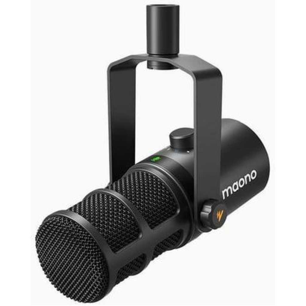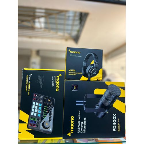 This bundle contains 3 items 1 of MAONO Podcast Equipment Bundle: Audio Interface mixer with Dual XLR Input for Podcast Streaming – MaonoCaster E2 Gen2 231 Upgraded Podcast Equipment Bundle: Elevate your podcasting, streaming, and studio recording with the E2 Gen2 podcast equipment bundle. This all-in-one solution offers an intuitive design that allows you to start your podcasting journey right away. With two XLR combo inputs and a high-quality preamp offering 60dB gain, E2 GEN2 is perfect for co-hosts. Plus, the USB-C and 3.5mm ports make it easy to connect to phones and computers, ensuring smooth and clear audio every time Crystal-Clear Audio with XLR Interface: The E2 Gen2 podcast interface has two premium and low-noise preamps, delivering up to 60dB of gain. This ensures you get rich, clean sound even when using dynamic microphones. Whether you’re a beginner or a pro, the E2 gen2 eliminates needing an external preamp. Noise reduction technology keeps unwanted sounds like fan noise away, so your podcast recordings stay pristine Add Personality with 8 Custom Sound Effects: Bring your content to life with the E2 gen2’s 8 customizable sound effect buttons. Perfect for podcasters and streamers, you can upload your favorite intro music, quirky sound bites, or custom effects to engage your audience. Each button supports up to 20 seconds of recording with adjustable volume, making it the ultimate podcast mixer to add personality to your shows Ultimate Convenience for Podcasters and Content Creators: The E2 Gen2 podcast mixer features a one-touch mute button, so you can easily handle any mishaps during podcast recording. The monitoring button lets you listen to your own voice while gaming, allowing seamless communication with teammates and clear game audio. The Loopback function enables you to start a live stream with just one computer. Plus, the built-in 1500mA battery offers up to 8 hours of use, so your podcast never has to stop Enhance Your Podcast Atmosphere: Add flair to your podcast with E2 Gen2’s pitch-changing effects. Whether creating a fun atmosphere or protecting your privacy, the interface’s versatile options let you adjust your voice for added entertainment. Choose from six preset reverbs to set the perfect mood for any show. SingAlong mode even allows you to hear the singing without your audience hearing it, letting you shine as a performer Flexibility for Any Creator’s Setup: The XLR interface gives podcasters and content creators total flexibility with various I/O options. Input-wise, you can use Bluetooth to add clear background music or connect your phone to the AUX-IN/USB-C ports. For output, connect your phone to STREAM OUT1/2 and USB-C ports. For computer live streaming, simply connect to the USB-C port and hit the Loopback button to manage both input and output effortlessly Compatibility and Package List: The podcast audio interface supports computer, smartphone, and tablet connection, is compatible with Mac and Windows systems, and can also connect musical instruments, while the plug-and-play function makes installation a breeze. Package List: 1*audio interface, 1*USB-A/USB-C to USB-C cable, 1*3.5mm audio cable, 1*user manual. Audio Device Only – E2 Gen2 is designed for audio recording and mixing. Does not support phone charging or power delivery functions. 1 of MAONO XLR Podcast Microphone, Cardioid Studio Dynamic Mic for Vocal Recording, Streaming, Voice-Over, Voice Isolation Technology, Metal Mic, Works for Audio Interface, Mixer, Sound Card-PD100 827 GET An IMPRESSIVE BROADCAST-SOUND QUALITY: The PD100 dynamic XLR microphone focuses on podcasting, vocal recording, streaming, and content creation. Built-in dynamic core and inner double layer pop filter, thanks to the noise isolation technology, better attenuation of plosive. Well-balanced reproduction across a wide frequency response range 60-14kHz, delivering clean and mellow audio. works great for podcasters, streamers, and Content creators START YOUR HOME STUDIO HERE: The PD100 XLR Podcast microphone features a cardioid pattern and “Talk to the Mic Top”pick-up way, so that the dynamic recording microphone captures every detail of your voice with smooth and more depth, find the voice you want and own it, and let your sound more center and front, so your streaming or recording will more clear, natural. keeping you in the spotlight, and letting you have a good performance when live streaming or podcasting STYLISH COMPACT DESIGN: This XLR microphone with metal body, sleek looks, compact size, makes it portable and durable. The mic with an additional 2.36 inch rod extender that can extend the height of the desktop bracket, make the microphone closer to you. The Metal brackets and thick circular base for stability and vibration damping, helps to keep your audio crystal and clear. Built -in 5/8″and 3/8″ inch threads to easy installed with most mic stands EASILY CONNECT WITH PROFESSIONAL INTERFACES: The PD100 Podcast recording microphone with XLR connection, works great with Maonocaster AME2, audio interface, or external mixer, whether radio program recording, singing, Home studio content creation, or a multiplayer live broadcast, it will bring you unexpected results, make your podcasting or streaming even better. your listeners will have good listening enjoyment ALL IN ONE MIC SET: XLR dynamic microphone with desktop stand * 1, mic rod extender* 1, heavy round metal base * 1, 6.56 ft XLR cable * 1,user manual * 1. Start your broadcast journey with a premium and affordable microphone set here HI-FI SOUND: UPGRADED DJ studio headphones MAONO MH601 is built-in 50 mm large aperture driver, for immersive sound, which can bring you better listening enjoyment. Exceptional clarity throughout an extended frequency range, with deeper, accurater bass response. Soft and comfortable close back ear pad reduce background noise to a certain extent, makes you focus on what you want to hear MULTI-FUNCTIONAL DESIGN: 