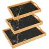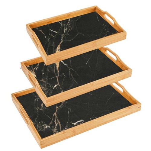 Key Features: Marble Print Bamboo Tea Serving Tray – 3 Set- Black. 3 Serving trays Features raised edges and cut-out carrying handles Made from naturally durable and heat-resistant bamboo Lightweight, portable, and won’t warp or be easily damaged by hot plates or mugs. Brown in Color Eco-friendly