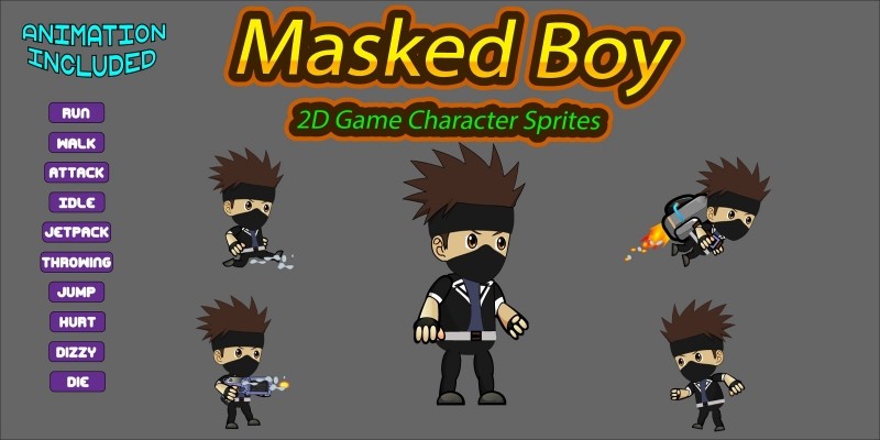 Masked Boy 2D Game Character Sprite. 2D Game Character Sprite Sheets This pack is suitable for shooting games, running games, platform games, and side-scrolling games