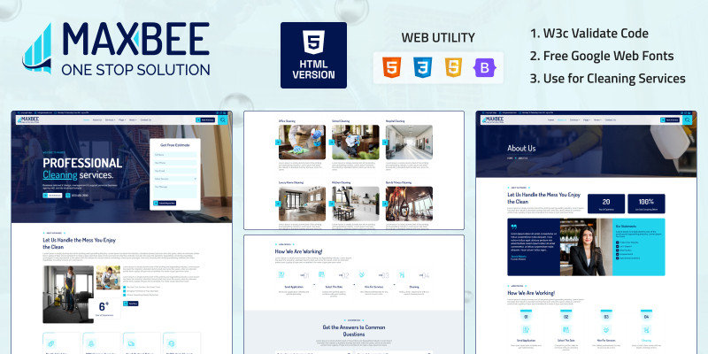 Maxbee - Cleaning HTML Template. Maxbee is a responsive, modern HTML template for cleaning companies, built with Bootstrap 5 and easy to customize.