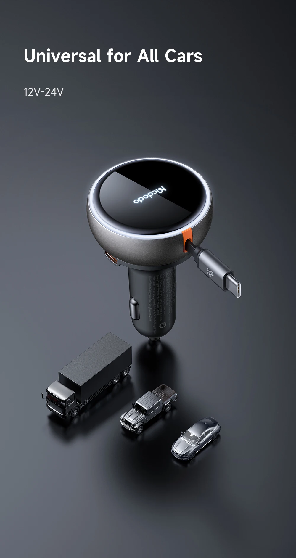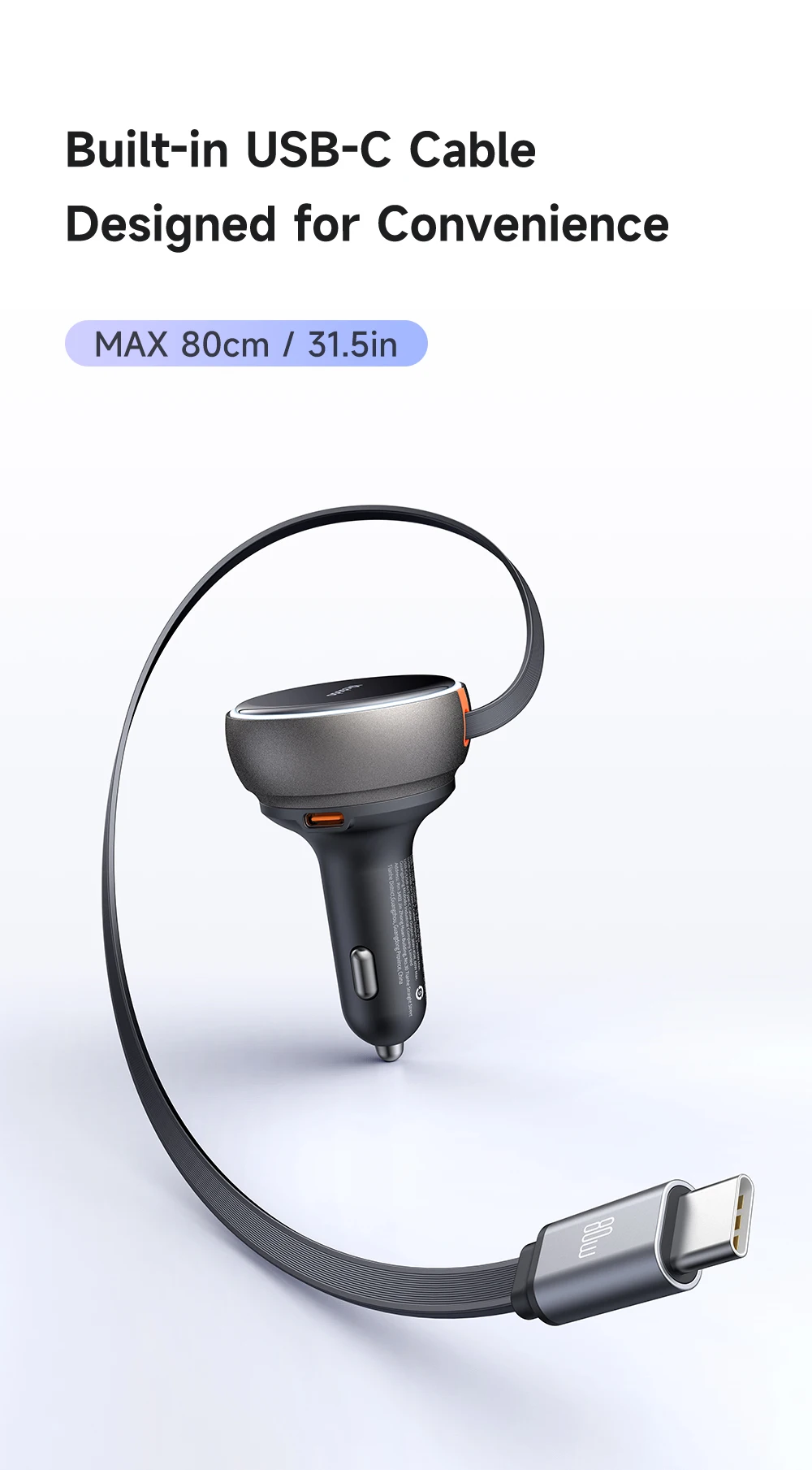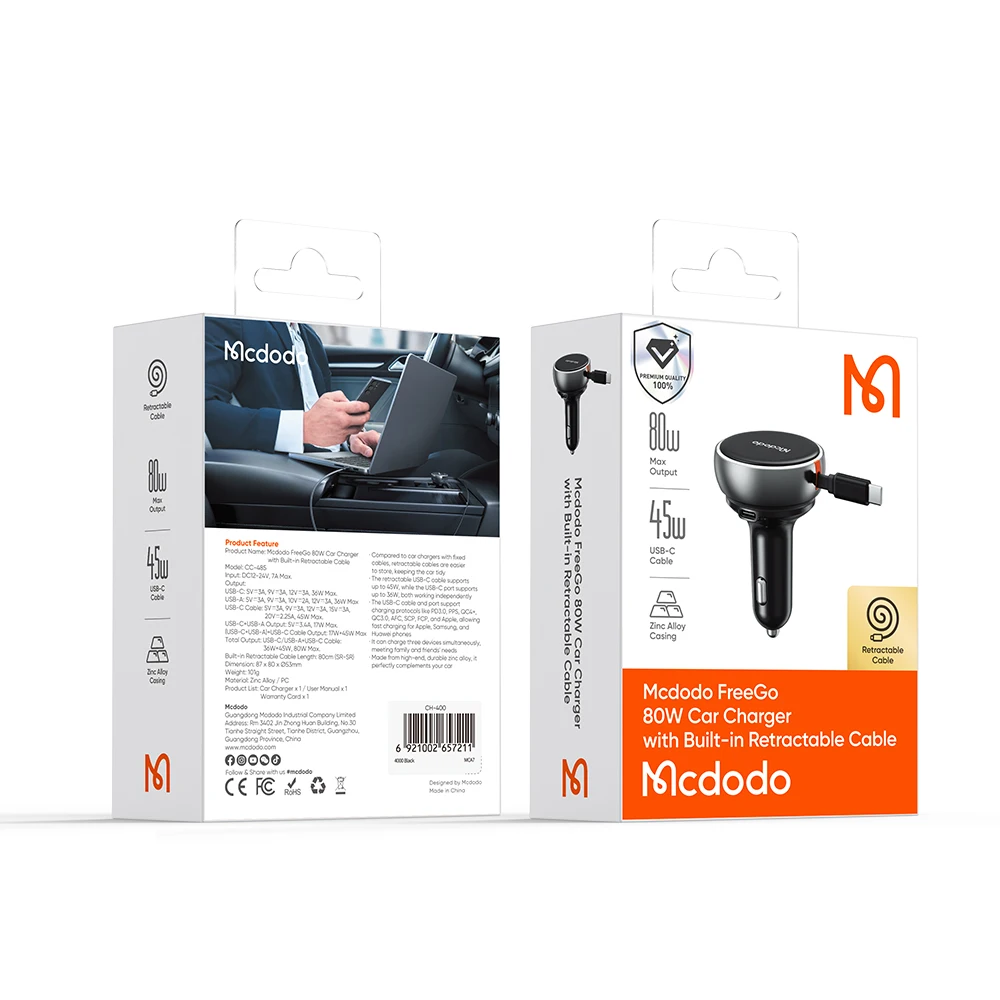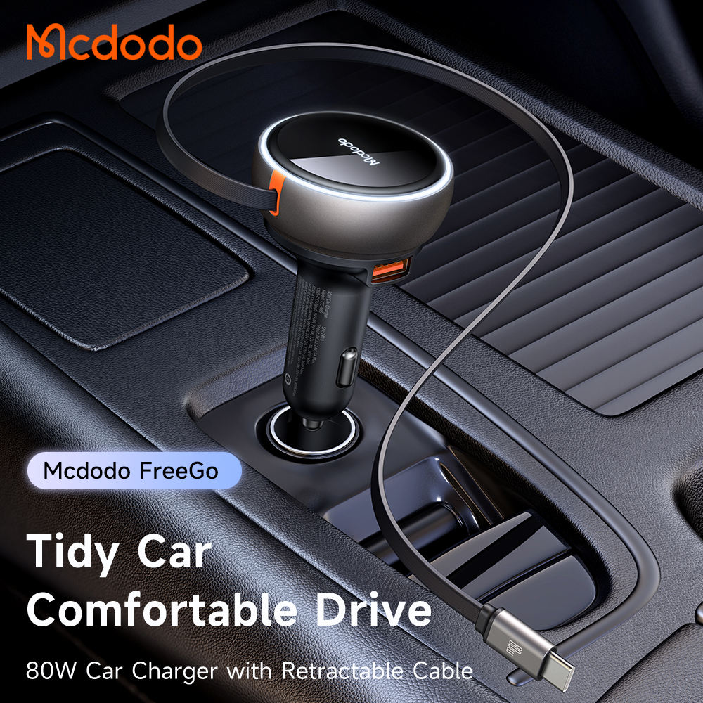 Product Key Features: Mcdodo 485 FreeGo 80W PD Car Charger Retractable Cable 80cm 80W PD3.0 PPS QC4+ AFC SCP Fast Charger in Car with USB-C Cable