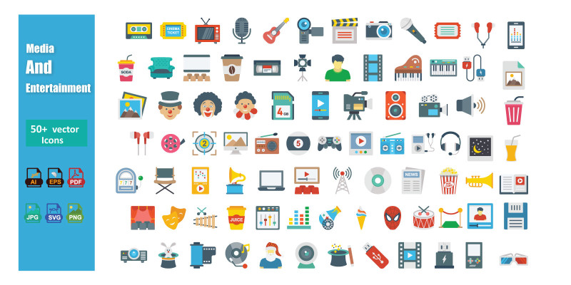 ​Media And Entertainment Icon Pack. 50+ flat & line style media icons for music, film, gaming, and more. Fully editable, scalable & perfect for apps, websites