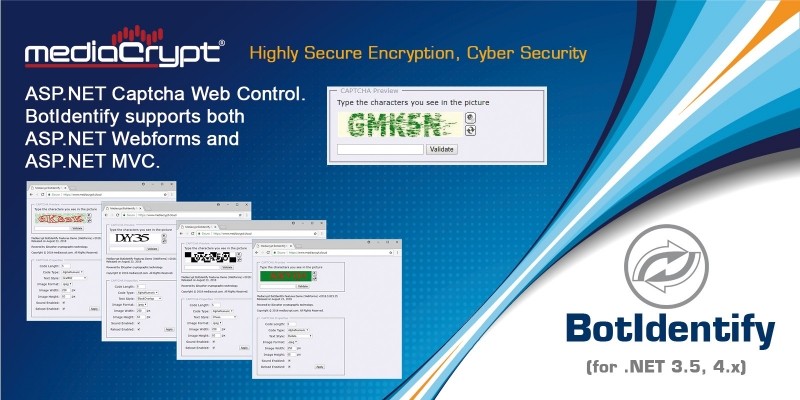Mediacrypt BotIdentify .NET. ASP.NET Captcha Web Control. BotIdentify supports both ASP.NET Webforms and ASP.NET MVC.
