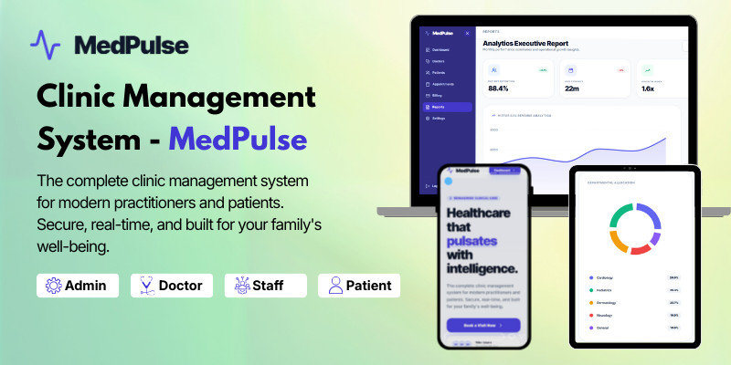 MedPulse - Pro Clinic Hospital Management System. Professional healthcare platform with appointment booking, billing, doctor/patient portals, and advanced clinical analytics.