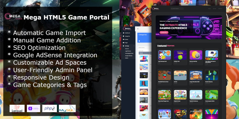 Mega HTML5 Game Portal. The ultimate HTML5 game portal script designed for seamless gaming experiences and effortless management.