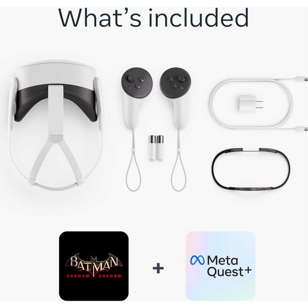 Discover the magic of Meta Quest 3S and get ready to experience your favorite apps in a totally new way. The possibilities are endless when you can blend digital content into your physical space. Watch movies and shows on a vibrant screen that turns any room of your house into a giant theater. Bring games to life in your living room, or step right into the action with full immersion. Hang out with friends from anywhere, but feel like you’re in the same place, watching a concert or meeting up in Meta Horizon. Wireless and light, enjoy out-of-this-world workouts with Quest 3S that make fitness fun. With unreal experiences at an unreal price, where will you begin? See child safety guidance online; Accounts for 10+. Key Features: Transform your reality and do everything you love in totally new ways. Welcome to Meta Quest 3S. Now you can get the Batman: Arkham Shadow* and a 3-month trial of Meta Quest+** (a combined $70 value) with purchase. Batman: Arkham Shadow available to play 10/22. Explore thousands of unreal experiences with mixed reality, where you can blend digital objects into the room around you or dial up the immersion in VR. Have more fun with friends in Quest. Whether you’re stepping into an immersive game with people from around the world, watching a live concert together in Meta Horizon or inviting everyone over to cast your play onto the TV. Multi-tasking has never been this easy. Pull up multiple screens at once to browse the web, watch YouTube and direct message with friends — all while keeping your room in view. Turn any room into your own personal theater. Dim the space around you and watch on a giant, vibrant screen. Go all in with USB-C headphones, or plug in any 3.5mm headphones with a USB-C adapter (sold separately). Access social media apps like WhatsApp, Instagram and Facebook Messenger so you can play while you stay in the group chat. Move with ultimate wireless freedom and lightweight comfort when you get your heart pumping in virtual workouts or use your whole body to bust ghosts in your living room. Enjoy powerful performance that brings virtual objects to life with 2X the graphical processing (GPU) compared to Meta Quest 2*. Use your hands to swipe through content or your Touch Plus Controllers for realistic sensations and fine-tuned precision. *Based on the graphic performance of the Qualcomm Snapdragon XR2 Gen 2 platform vs the Meta Quest 2 platform. Feel safe to share the fun. Manage parental controls, check your child’s daily usage, add multiple users, share content and set permissions for everyone in the family. See child safety guidance online; Accounts for 10+.