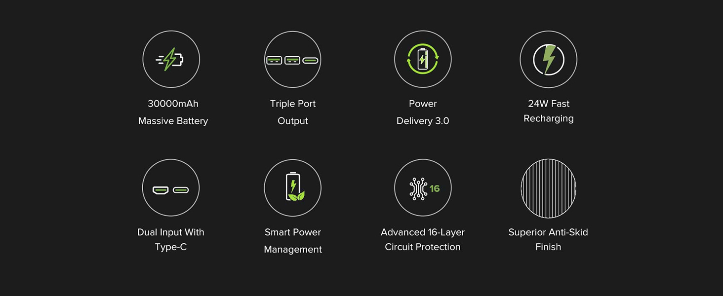 From the manufacturer Key Features: Massive 30000mAh Battery Capacity Power Delivery 3.0 Triple output port 24W Ultra Fast Recharging