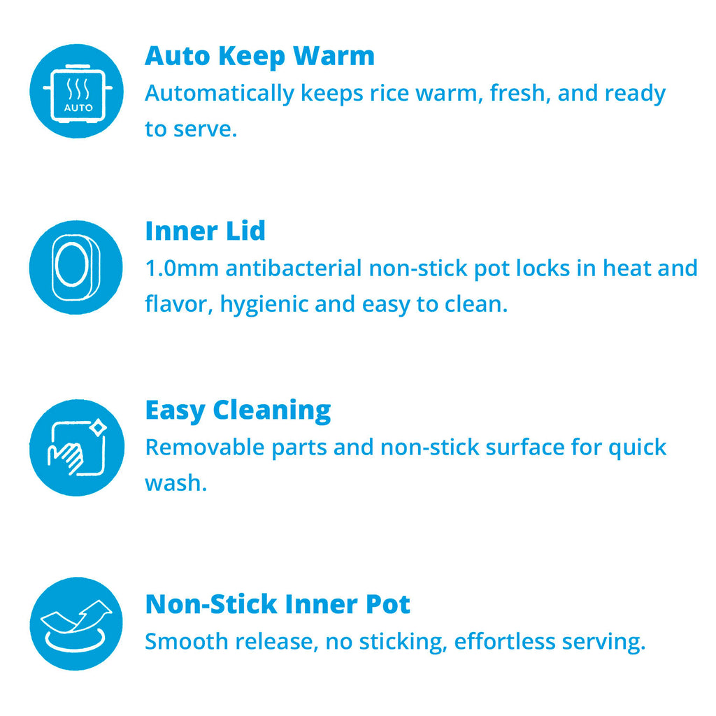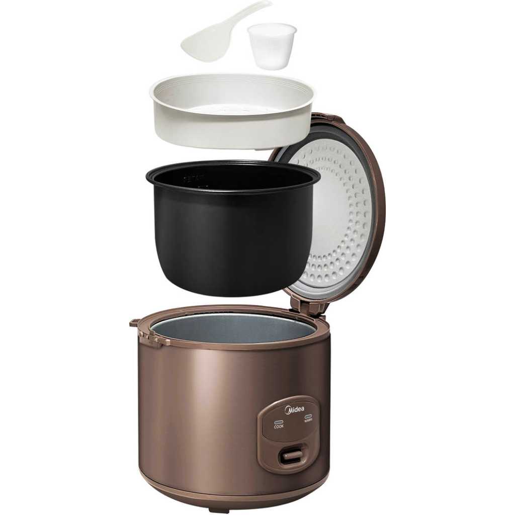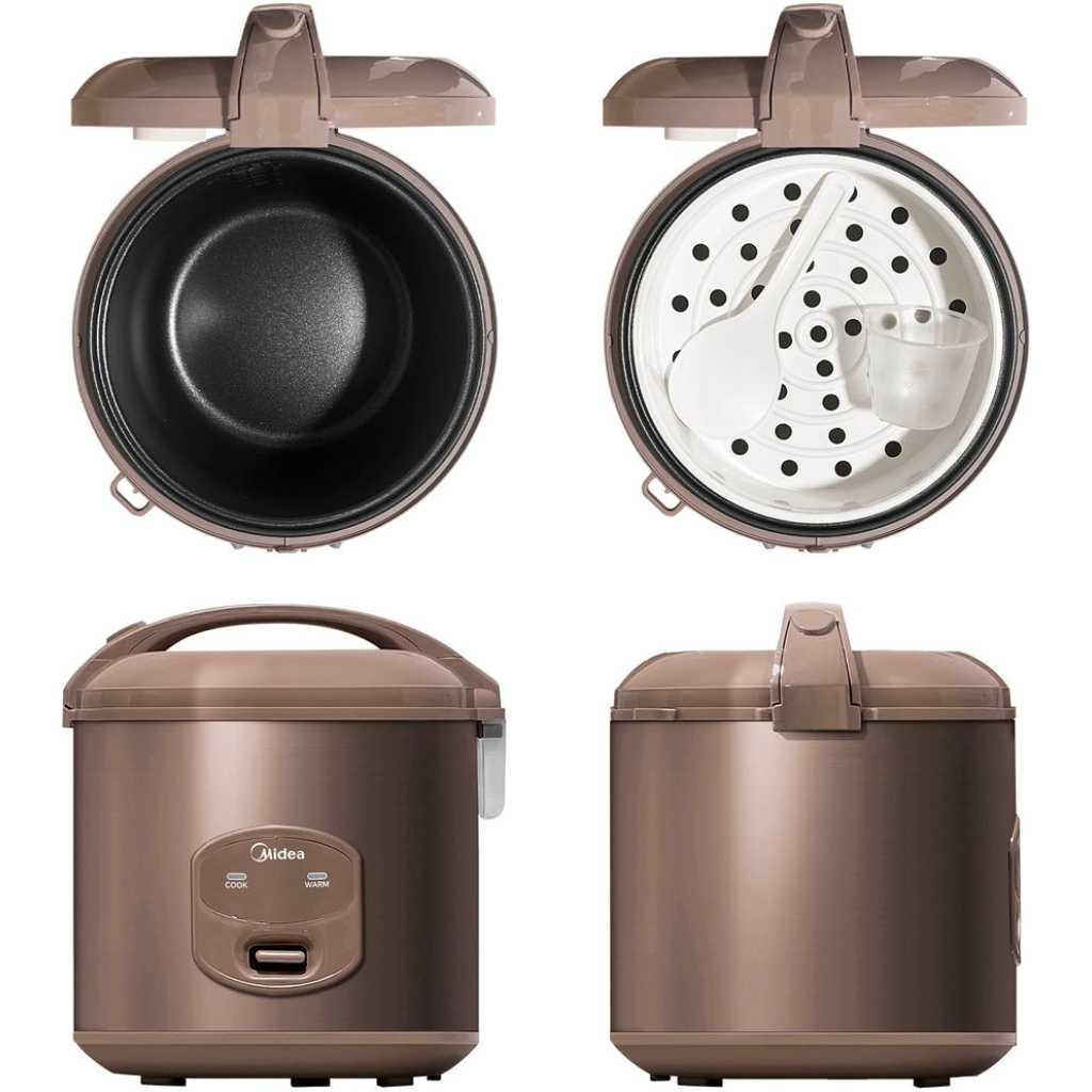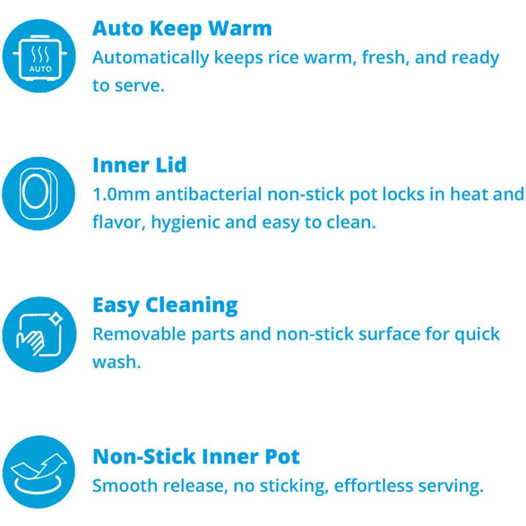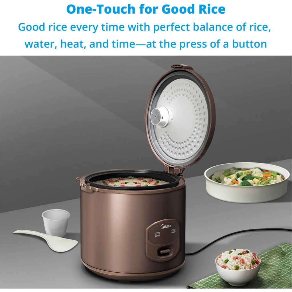 Inner pot designed to handle up to 3LL of uncooked rice. Keep-Warm Function : Maintains the ideal serving temperature automatically after cooking. One-Button Operation : Full cooking cycle is handled with a single button – simple, fast, and efficient. Non-Stick Inner Pot: Durable coating prevents food from sticking and makes cleaning quick and effortless. Multi-Function Cooking: Easily cook rice, steam, stew, and more with just one press – ideal for everyday meals. Easy to Clean: Features a detachable upper cover and non-stick pot for minimal cleanup effort. Compact Design: Space-saving size with a clean brown finish – fits neatly in any modern kitchen.