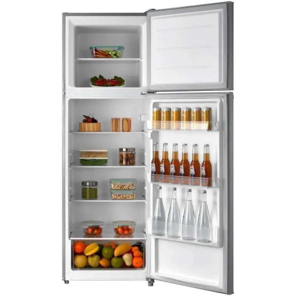 Midea 414 Litre Fridge, (Net 294L), MDRT414FGF02, Double Door Top Mount Freezer Defrost Refrigerator - Silver. Fast coolingStrong compressor helps in fast and even cooling Double door defrost refrigeratorEquipped with a fixed Compressor and a defrost drain to ensure all-around freshness. Manual Temperature controlManual temperature control knobs helps in maintaing the temperature as needed Recessed handle designRecessed handle design increases the astheic looks and is very convinent to use. Fruit and Vegetable CrisperSeparate Crisper helps in storing fruits and vegetables fresh for longer time Low Noise43dB - silent operation