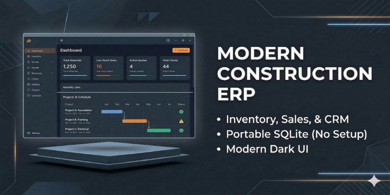 Modern Construction ERP - Java SQLite. Complete desktop inventory and sales management system. Built with Java, FlatLaf dark theme, and portable SQLite database.