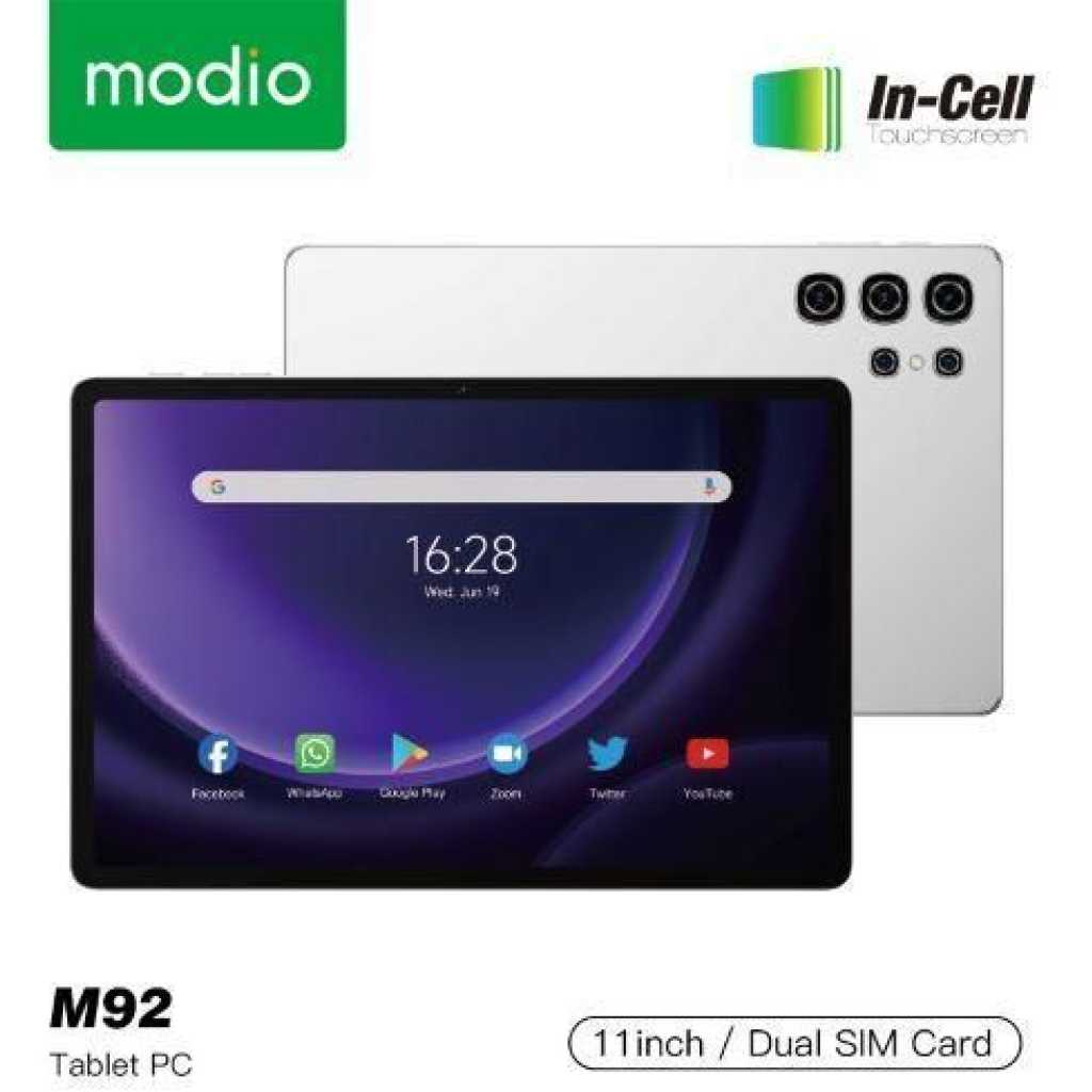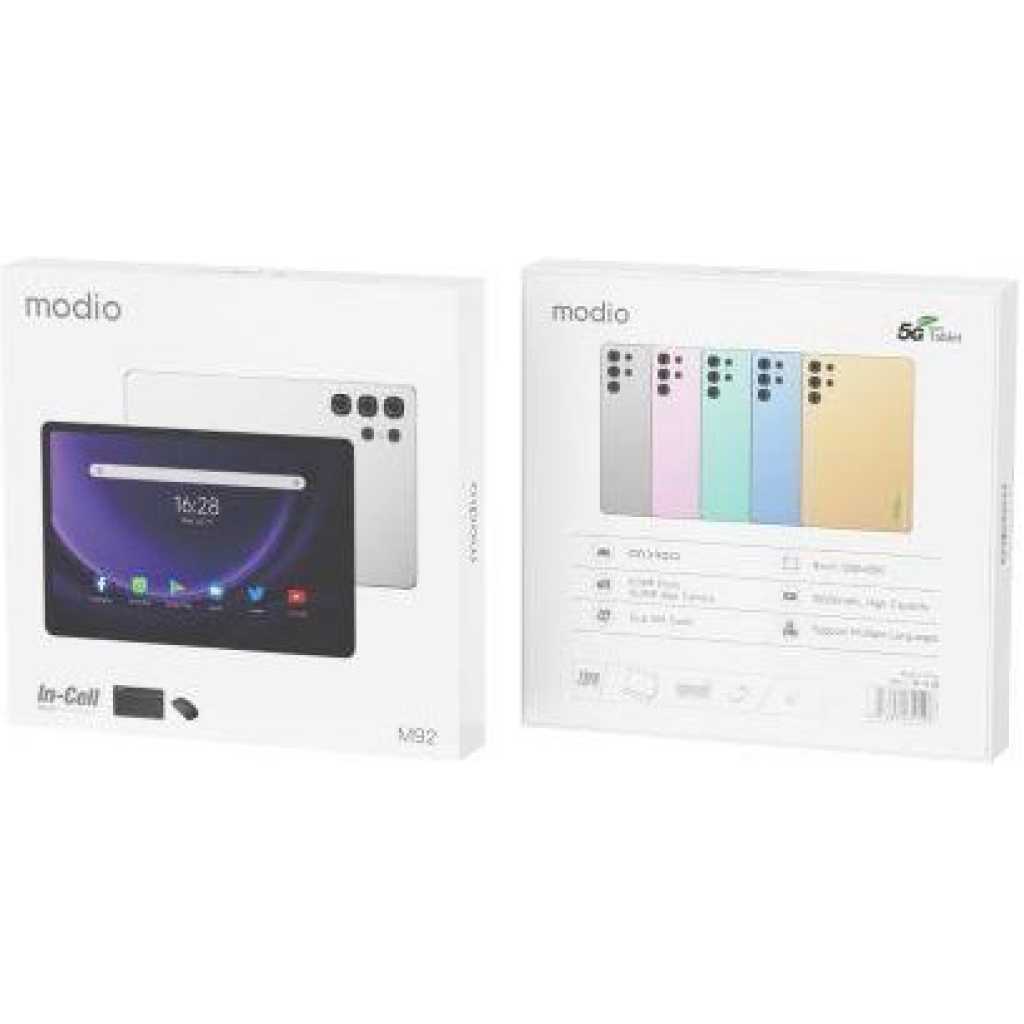 Key Features: Modio M92 5G Tablet, 16GB 1TB ROM,10000mAh High Capacity Android 13 ,11 inch Series 128*800 In-cell Screen RAM: 16GB Storage: 1TB Support: Dual SIM Screen Size: 11-inch 1280×800 IPS OS: Android 13 Processor Type: Octa-Core 1.6GHz Camera: Primary 13.0 MP, Secondary 8.0MP Data : 5G LTE, WIFI Connectivity: 5G, Wi-Fi, Bluetooth Battery: 10000mAh
