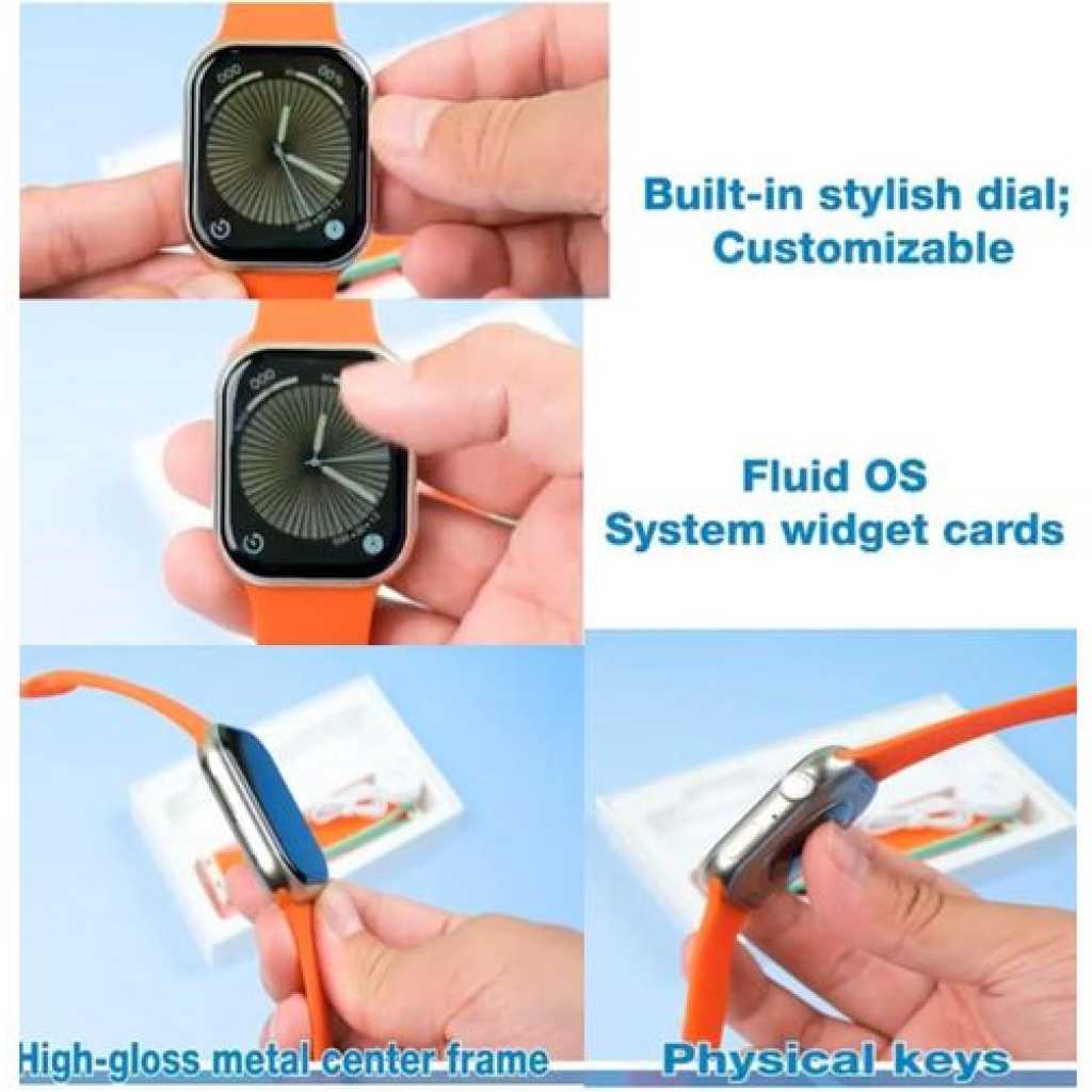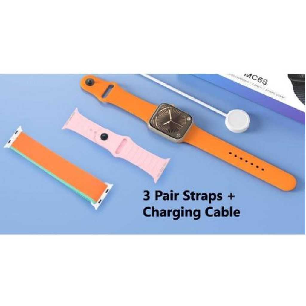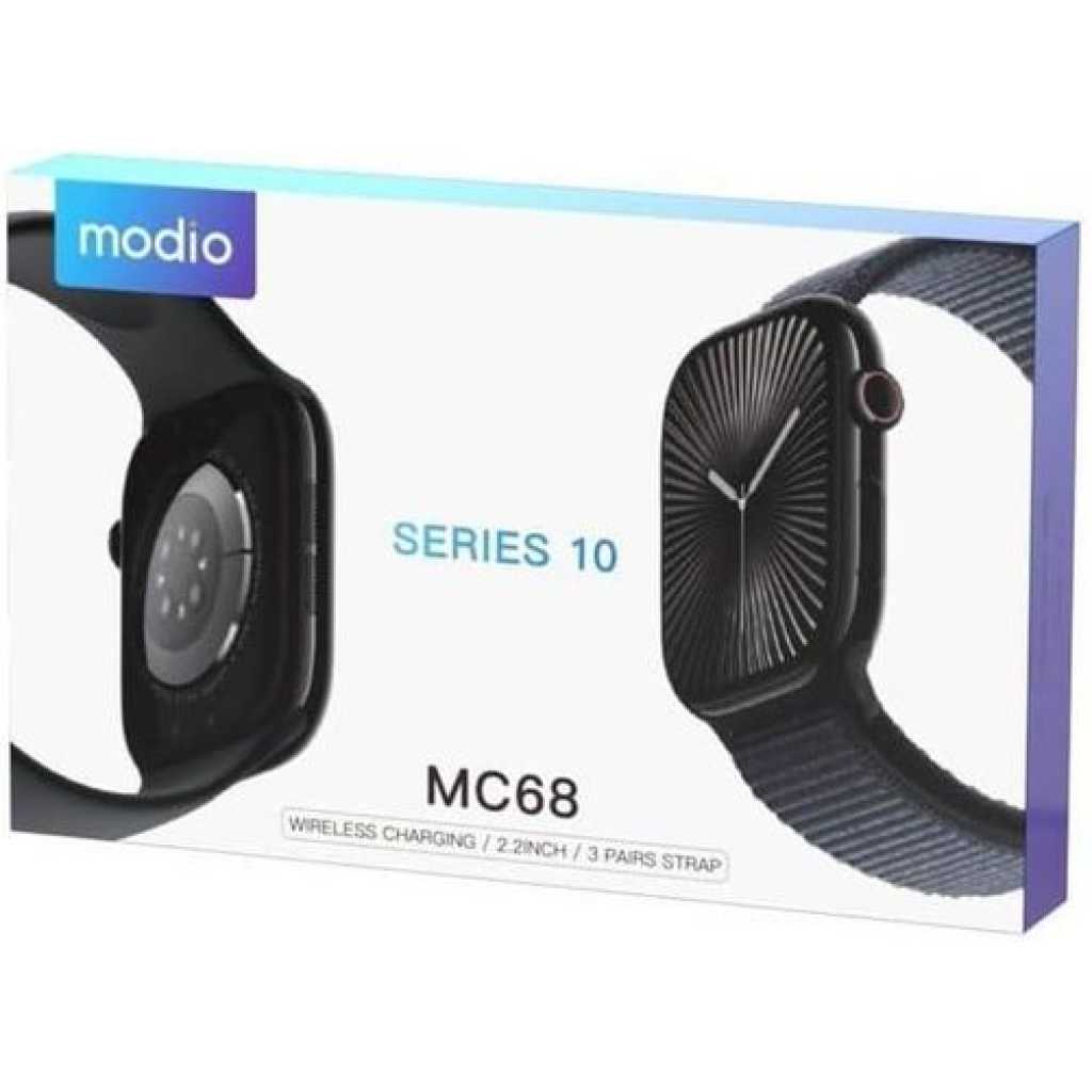 Large 2.2-Inch Display: Features a stunning 2.2-inch full-color, high-definition touchscreen, providing an immersive viewing experience. The large screen allows easy reading and smooth touch navigation. Universal Compatibility: Seamlessly connects with both Android and iOS devices, offering wide compatibility so you can pair it with almost any smartphone. Wireless Charging: Effortlessly charge the watch with the included wireless charger Strap Options: Comes with three interchangeable straps, allowing you to customize your look Multiple Dial Faces: Offers a wide selection of customizable dial faces, from digital and analog styles to fitness-focused screens, allowing you to personalize it for every occasion or activity. Fluid OS System with Widget Cards: Built with an intuitive OS that allows smooth transitions, quick navigation, and supports widget cards for fast access to apps and essential information, such as weather, calendar, or activity stats. This makes for a responsive and user-friendly experience, minimizing any lag. Heart Rate Monitor: Equipped with an advanced heart rate monitor that continuously tracks your pulse and provides detailed insights into your heart health throughout the day. Offers a comprehensive sleep tracking feature that logs sleep duration, stages (light, deep, REM), and overall sleep quality, helping you optimize rest and recovery. Multiple Sports Modes: Supports a variety of sports and fitness modes, including running, cycling, swimming, yoga, and more. It provides real-time stats and post-workout analysis, helping you achieve your fitness goals with ease. OverviewThe Modio MC68 Series 10 Smartwatch is a sleek and versatile wearable device designed to enhance your lifestyle and keep you connected. With a large 2.2-inch display, wireless charging capability, and three interchangeable straps included, this smartwatch combines style, functionality, and convenience. The elegant silver set display adds a modern touch, making it the perfect accessory for any occasion.