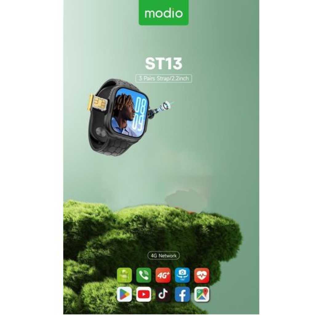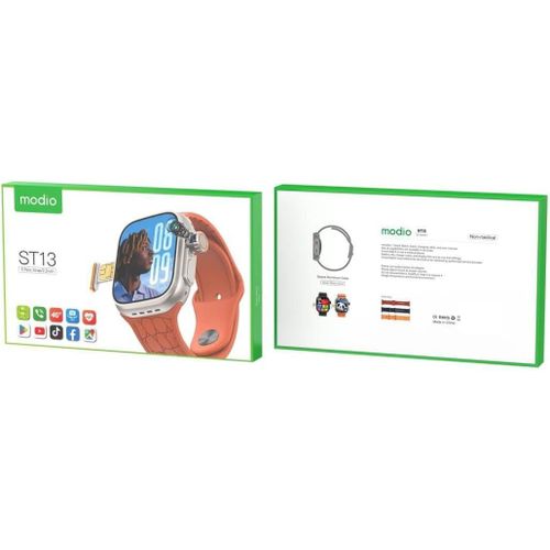 Introducing the Modio ST13 Smart Watch, a cutting-edge wearable device that combines style and functionality seamlessly. With its impressive 2.2-inch full-screen display, this smart watch offers a visually captivating experience, making it easy to navigate through various features and applications. Designed for both ladies and gents, the Modio ST13 boasts 4G SIM card support, allowing you to stay connected on-the-go without relying on your smartphone. Elevate your style game with three interchangeable straps, enabling you to effortlessly switch between different looks to complement your outfit or mood. Enjoy the convenience of wireless charging, eliminating the hassle of tangled cables. Whether you’re an active individual or a tech enthusiast, the Modio ST13 Smart Watch is the perfect accessory to enhance your lifestyle. Key Features: Comprehensive Connectivity: The Modio ST13 Smart Watch offers 4G SIM card support for seamless connectivity on the go. Expansive Display: Enjoy a vibrant and immersive viewing experience with the 2.2-inch full-screen display. Versatile Style: Included are three interchangeable straps, allowing you to customise the watch’s look for any occasion. Convenient Charging: Stay powered up effortlessly with the included wireless charger. Unisex Design: Crafted with both ladies and gentlemen in mind, this smart watch offers a stylish and functional accessory for all.