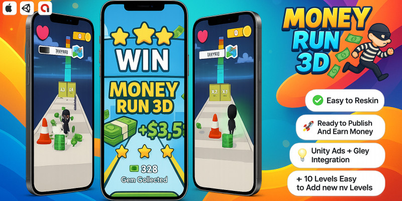 Money Run 3D - Hyper Casual Mobile Unity Game. Hyper Casual 3D Unity Game Source Code! Perfect for mobile, game is optimized for Android & iOS. Built in Unity, easy to reski