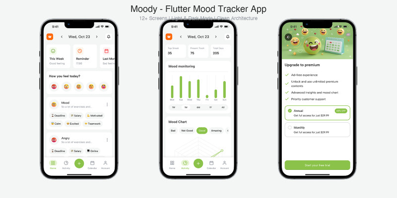 Moody - Flutter Mood Tracker App UI Kit. A beautifully designed Flutter mood tracking app with 12+ screens, light/dark mode, onboarding, analytics, calendar & premium