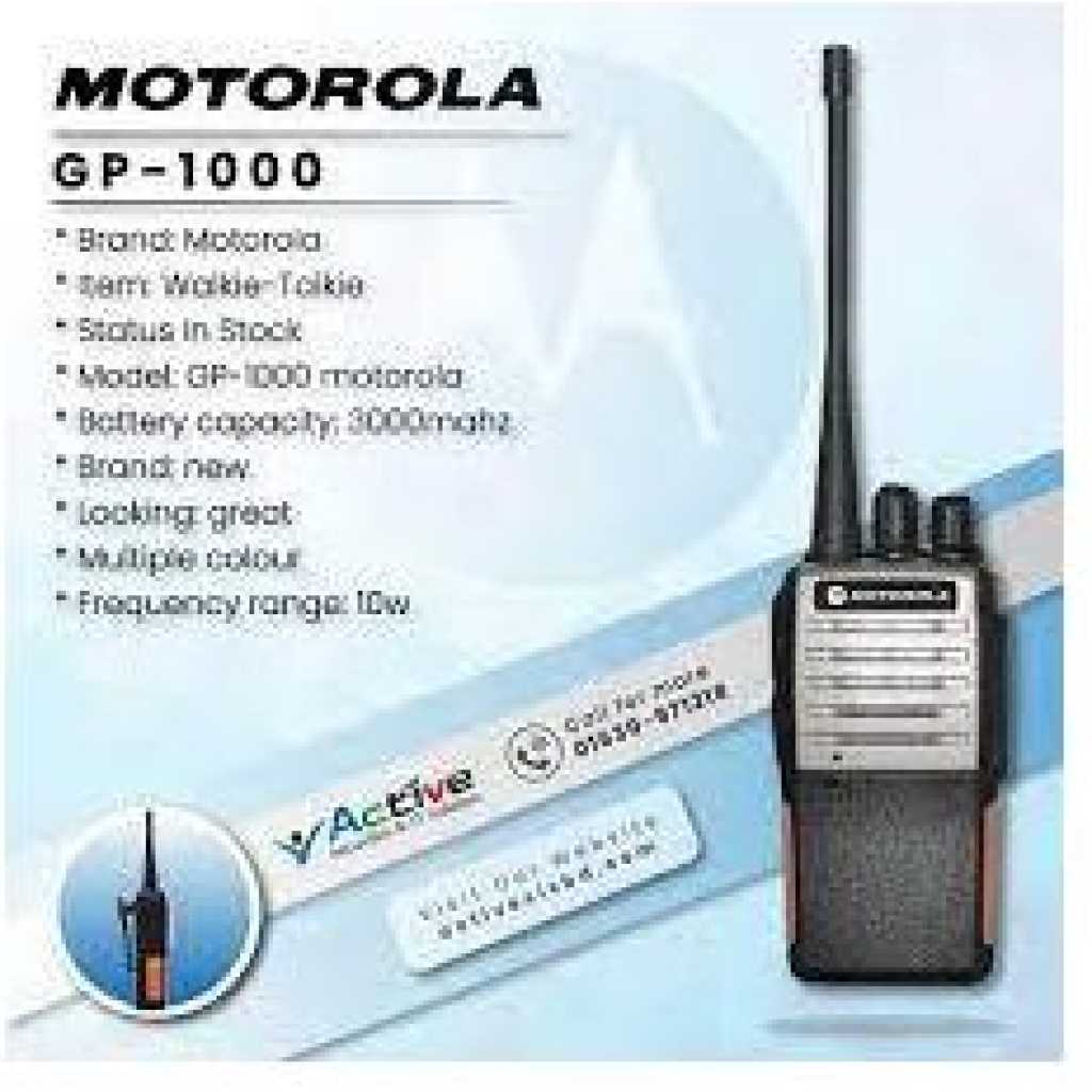 MOTOR VEHICLE MOTORS GP-1000 The radio frequency use: UHF 400-520MHz can be used in conjunction with all UHF frequency converters available on the market . signal strength, power output: 10W improve excellent communication ability up to 4km. Motorola GP-1000 has a very aesthetic design, the front of the machine owns white silver alloy plate makes the machine becomes luxurious. The sound of the machine is Motorola’s investment in digital audio chips to deliver extremely clear sound. Compact, lightweight yet extremely portable, weighing in at 250g. Motorola GP-1000 is equipped with ultra-fast 3000mAh battery with Li-ion battery technology, very suitable for its capacity. Battery life is up to 36 hours, 15 days standby time. With the capacity of 10W reception in communication conditions up to 4km, the inner city 2.5km. The cuffs are equipped with FM radio receivers that can hear a wide variety of channels for security guards or recreational workers during breaks. MOTOROLA GP-1000 TECHNICAL SPECIFICATIONS Number of Channels: 16 Channels Dimensions (W x H x D) high x depth): 50 x 120 x 25 mm. The kit includes: Body, antenna, battery, adapter, table charger, Handset back – Talk time up to 36 hours with 5: 5: 90 – call waiting time 10-15 days – Motorola GP-1000 Talk Radio Widget + Inner City 2 – 3 Km. + Outskirts 3 – 5 Km + Ideal conditions 7 – 10 Km For building 25-40 floors, UHF frequency is very good. Motor Vehicle Motor GP-1000 Radio Frequency Used: UHF 400-520MHz Can be used with all UHF frequency converters available at any walkie-talkie shop in Dhaka. Signal strength, power output: 10W improves excellent communication ability up to 4km. Motorola GP-1000 has a very unique design, the front of the set has a white silver alloy plate which makes the machine look amazing. The set’s sound is an investment in Motorola’s digital audio chips to deliver highly smooth sound. Compact, lightweight yet highly portable, weighing 250 grams. Motorola GP-1000 is equipped with an ultra-fast 3000mAh battery with Li-ion battery tech, very consistent for its capacity. Battery life is 36 hours, with up to 15 days of standby time. The inner city is 2.5 km, with 10W reception power under communication conditions up to 4 km. The cuffs are equipped with FM radio receivers that can listen to a variety of channels for any type of security guard or recreational worker during breaks.