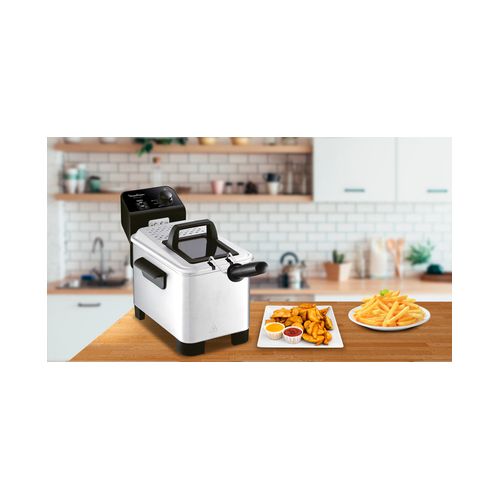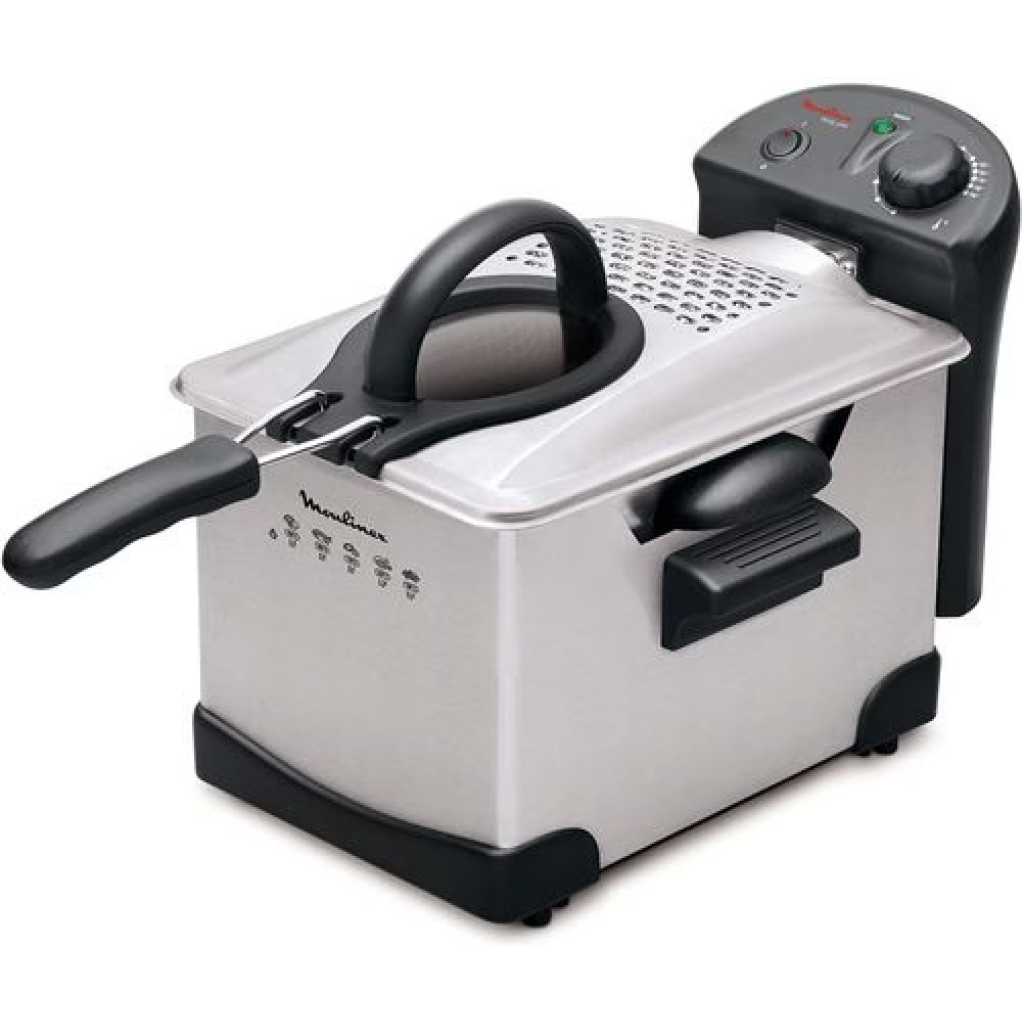 Moulinex Easy Pro 3 Litres Single Deep Fryer AM330027 – Silver MOULINEX EASY PRO It has never been so easy to deep-fry like a pro! Easy Pro is a 3L semi-pro fryer with cool zone technology.With Easy Pro, you can cook up to 1.2 Kg of delicious French fries, just like a pro.It has an immersed heating element for fast and perfect results. Its enamel bowl is removable so it is very easy to use and to clean. Easy Pro can be fully dismantled and all elements except heating block are dishwasher safe.You can set the temperature from 150°C to 190°C and monitor your cooking thanks to the viewing window on the lid. The lid can be used while frying and is equipped with a permanent metallic filter.With Easy Pro, it has never been so easy to deep-fry like a pro!
