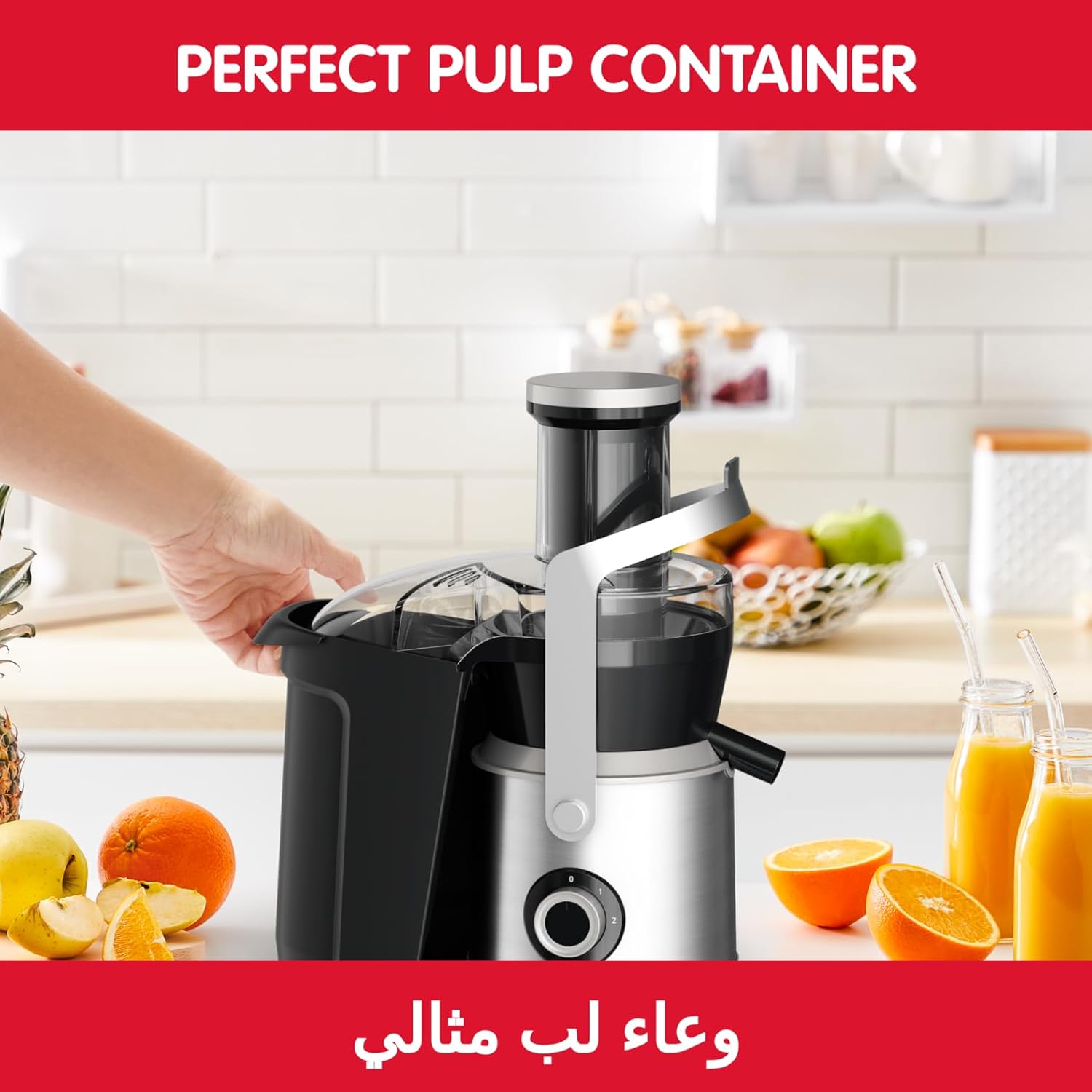 Key Features: XXL FEEDING TUBE: An easy-to-use juicer equipped with an extra-wide (85 mm) feeding tube for perfect fresh juice at home with less chopping and pre-cutting of fruits and veggies DRIP-STOP DESIGN: Discover mess-free juicing that couldn’t be easier with the drip-stop function designed to prevent countertop splashes after your juice has been prepared. ALUMINIUM HANDLE: Robust performance, easy handling/storage and dependable use day after day thanks to the high-quality aluminum handle and stainless steel accents on the housing. 2 SPEEDS: A juice extractor designed for total ease and versatility, with two speeds to cover all your juicing needs. 15-YEAR REPAIRABILITY: Low-cost parts available in our 6200 repair centers worldwide, for quick repair over many years—part of our commitment to help protect the environment and cut down on waste. PERFECT PULP CONTAINER: The 2.2 L pulp container ensures enough space for generous juicing, with an ergonomic design for effortless emptying. LARGE CAPACITY: The 0.8 L capacity is ideal for a wide variety of occasions—single servings, sharing with family members and entertaining guests—with a foam separator for a flawless final product. WHAT’S IN THE BOX: Nutri XXL Juicer, 0.8 L juice container.