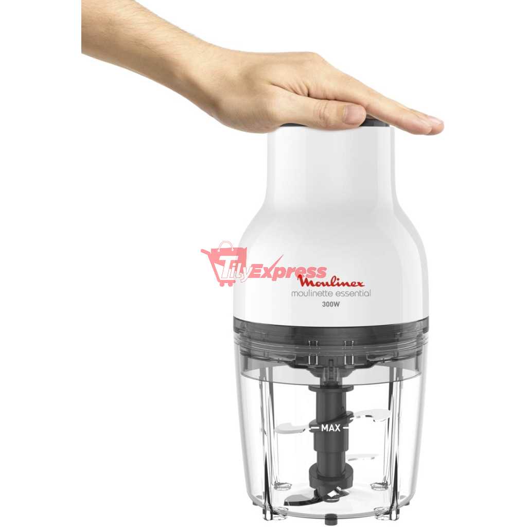 Key Features: Moulinex Moulinette Essential Chopper, 300 watts, Plastic, DJ520127 – White /Black. POWERFUL PERFORMANCE: 300W LONG-LASTING BLADES: 4 sharp stainless steel blades 3-IN-1 ACTION: Once convenient device that minces, chops and mixes VERSATILE CAPACITY: 0.4 L capacity SECURE DESIGN: Non-slip feet SAFE CLOSURE: Double-security design of the lid CONVENIENT CLEANING: Dishwasher-safe