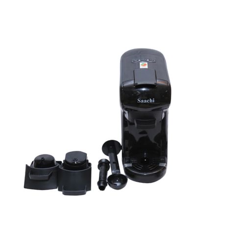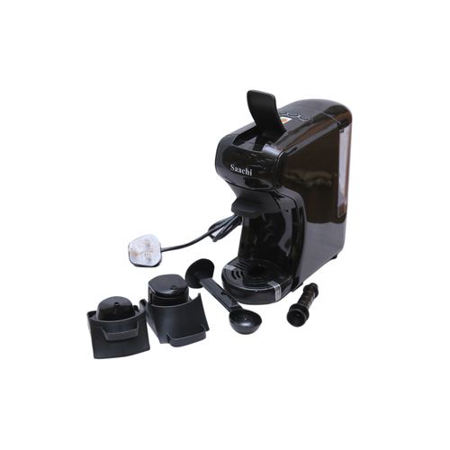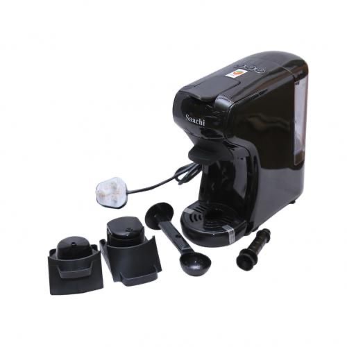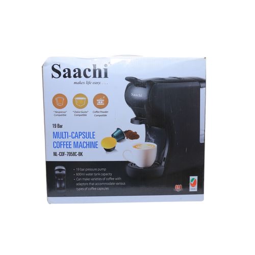 Saachi 19Bar Multi-Capsule Coffee Machine; Nespresso, Gusto and Coffee Powder compatible -Black The next generation of coffee makers is finally here. The Saachi Capsule Coffee Maker can make all your favourite types of coffee with ease. The appliance can be used with store-bought coffee capsules containing a variety of flavors or can also be used with regular coffee powder. This appliance is compatible with both Nespresso and Dulce Gusto capsules making it one of the most convenient coffee makers in the market today. The product is available in 4 different colours providing you with the ideal balance of style and functionality. It has a 19 bar automatic steam pressure pump and a 600ml water tank. It also has two dispensing methods (short or long) making it adaptable to your preferences. Can make varieties of coffee with adoptors that accomodate various types of coffee capsules. Compatible with Nespresso, Gusto and Coffee powder. Two dispensing buttons, short or long, and can be programmed or manually operated for dispensing and interruption. 19 Bar Pump guarantees an optimum extraction for various kinds of coffee The drip tray can be adjusted on two levels and collects excess liquid. The Light Indicator warns that the Coffee machine is ready for use after approximately 45 seconds from starting. Powe saver function allows an automatic shut down after 15 minutes of being inactive Removable transparent tank with 600ml capacity Power. 1450W Color. Black Model No. NL-COF-7058C-BKMain Material. Plastic