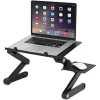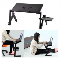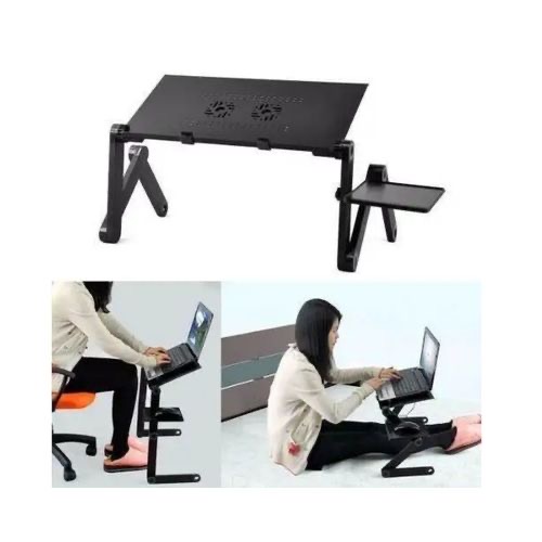 Key Features: This table can also accomodate big size laptops. Has Big cooling fan which is most effective. Also includes mouse pad. Black colour Light weight aluminum tray Fully adjustable Legs Rotate 360 Degrees and Lock in Place at Various Angles. Quickly Collapses The Stand to Make it Portable Multiple uses, For a TV Dinner Tray, Sound Equipment, Projector, Standing Desk, Book Tray, Writing Desk, and Tablet Hold Silent USB powered CPU Cooling funs Connect USB Cord (Included) to Your Computer to Power The Quiet Cooling