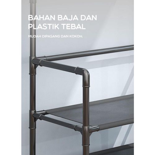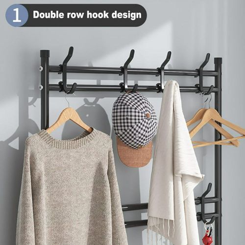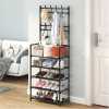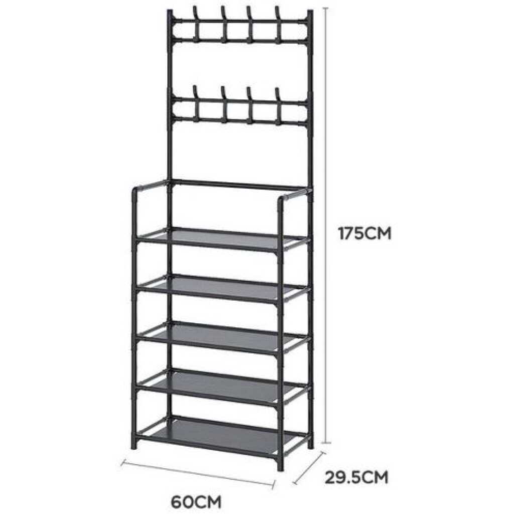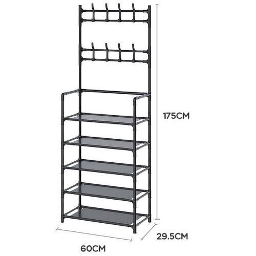 Multi-functional Coat Rack Stand with 5 Tier Shoe Rack Storage Clothes Rack with 8 Hooks Organizer. Standing tall in fashion and with functioning simplicity design and style, this elegant coat stand will let your hallway, entryway or balcony more organised. It is really part of an essential unit of your daily life. This unit offers you a clutter free home and a comfortable life. With the precisely design, the screws locate in the hole well and the holes are line up with the shelves. The metal outer layer is painted by baking varnish, being rustproof. A perfect coat rack and shoe storage bench, allow you to hang your clothes, bags, umbrellas, and store your shoes, storage boxes handbags in a limited space. 【Multifunctional Rack】This is the perfect combination of shoe rack, coat rack and other small items storage. No need to mount on the wall, no damage to your wall. This shoe rack is freestanding and removable. It can be placed anywhere and moved as needed. narrow shoe cabinet Suitable for multiple spaces, whether it’s an entryway, hall, foyer, hallway, bedroom or bathroom, etc. 【Save space】 The coat rack part has 2 layers with 16 removable hooks for easy storage of clothes, hats, bags, scarves, umbrellas, keys, etc. to meet various hanging needs shoe storage. 5shoe rack layers of non-woven dustproof shoe racks are designed to provide more storage space for storing shoes. 【High quality material】 The overall size of the hanger is LxWxH-23.5 inches x 11 inches x 67.5 inches. The frame is made of high quality 16mm thick plastic sprayed steel pipe, plastic joints and thick waterproof non-woven fabric. Dustproof, rustproof, more wear-resistant and strong load-bearing capacity. 【Easy Assembly】 provides easy to understand assembly instructions. With the help of the instructions, it can be easily assembled and disassembled without any special tools