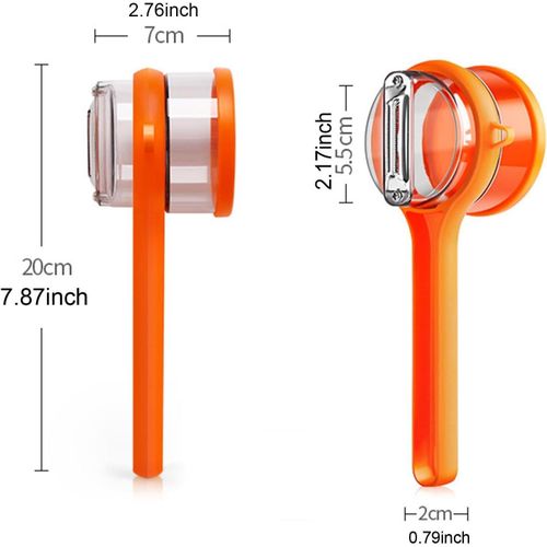 Multifunctional Sided Stainless Steel Blade Peeler with Storage Box Container Fruit and Vegetable Peeler- Multicolor Product Name: Peeler With Storage BoxColor: orange, greenMaterial:pp+psFunction: Peel fruits, vegetables, etc.Size:20*6.8cm/ 7.9 * 2.7-inch Features: Quick peeling, thin and no residueList: 1/2pcs*Peeler Versatile Utility: Our peeler with storage box is a versatile kitchen tool perfect for peeling, trimming, and slicing a variety of fruits and vegetables, offering functionality and convenience for everyday kitchen tasks.Mess-Free Peeling: Designed for efficiency, the peeler features twin sharp stainless steel that allows for quick and repetitive strokes to peel tough-skinned produce like potatoes, apples, and cucumbers, with the added of a storage container to collect peels and maintain cleanliness in your kitchen workspace.Ergonomic Design: The peeler is equipped with an ergonomic handle that accommodates both right and left-handed users, offering a comfortable grip and easy maneuverability. Additionally, a built-in potato eye remover enhances safety during use. Comfort and Convenience: The oversized handle of the peeler provides a comfortable grip for extended use, with a non-slip feature for enhanced control, even when wet. The large hole in the handle allows for easy hanging storage and accessibility. High-Quality Construction: Crafted from materials, the stainless steel ensures longevity and can withstand over 10,000 strokes, guaranteeing reliable performance. The BPA-free grip and practical design offer two different types of peelers to cater to varying peeling needs, making it a valuable addition to your kitchen utensil collection. 【Vegetable Peel Tool】: The vegetable peel tool is easy, quick, and smooth peeling, suitable for fruit and vegetables. – 【Easy to Clean】: This melon peel tool is easy to clean after use as its quality material does not easily absorb food residues. – 【Material】: Potato vegetable peel tool made of quality pp material, which has good durability for long term use. – 【Features】: Fruits peel tool and scoop with cover and grip, providing peace of mind when stored at home. – 【Wide Application】: Kitchen veggie peel tool has hanging hole. Suitable for fruit and vegetables, potato, zucchini, carrots, potatoes tomatoes, peaches, plums and more. Size Chart: 20cmx7cmx5.5cm/7.87inchx2.76inchx2.17inch Package Includes: 1 Vegetable Peel Tool