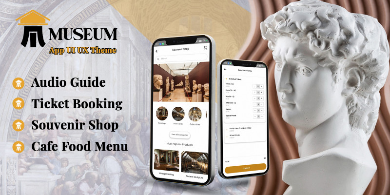 Museum UI Kit React. Museum Paintings Art Gallery Exhibition Artist Map Audio Tour Guide Online Ticket Purchase Souvenior