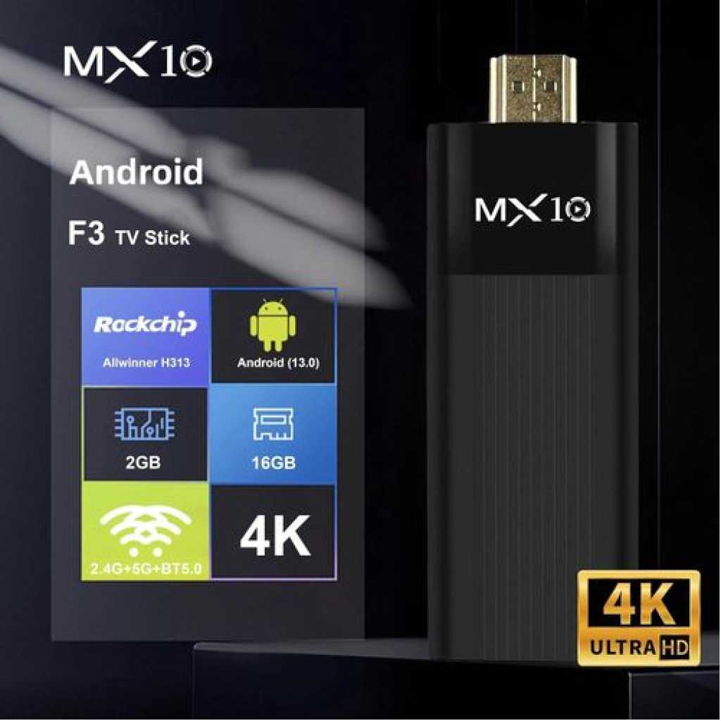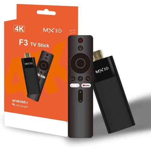 Immerse yourself in a world of entertainment with the MX10 F3 TV Stick. This compact device transforms your regular TV into a smart Android TV, granting you access to a vast library of streaming apps like Netflix, YouTube, Hulu, and more. With 4K resolution support, you can enjoy your favourite shows and movies in stunning clarity. The intuitive remote control makes navigation a breeze, allowing you to seamlessly switch between apps and content. Experience the convenience of having a wealth of entertainment options at your fingertips with this sleek and powerful TV stick. Key Features: 4K Ultra HD: Enjoy crisp, vivid visuals with stunning 4K Ultra HD resolution for an immersive viewing experience. Android TV: Powered by the user-friendly Android TV platform, granting access to a vast library of apps and streaming services. Voice Control: Control the device hands-free using voice commands with the integrated Google Assistant. Connectivity: Effortlessly connect to your home Wi-Fi network and stream content from popular platforms like YouTube, and more. Compact Design: The sleek, portable design allows you to easily move the device between TVs or take it on the go.
