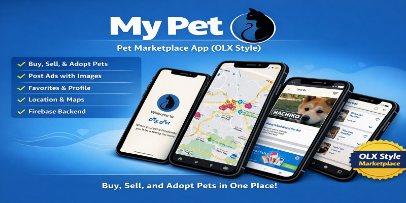 My Pet – Pet Marketplace App - OLX Style. A complete pet marketplace app (OLX style) to buy, sell, and adopt pets with Firebase backend.
