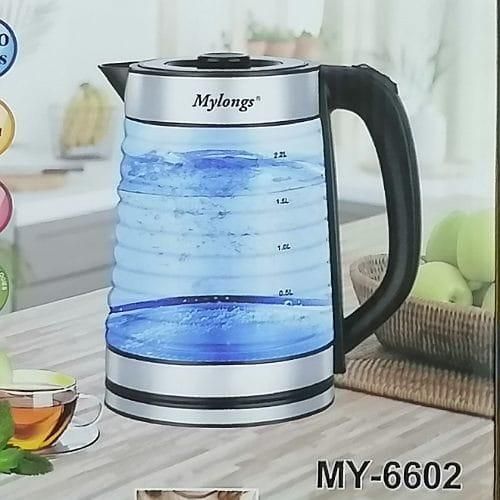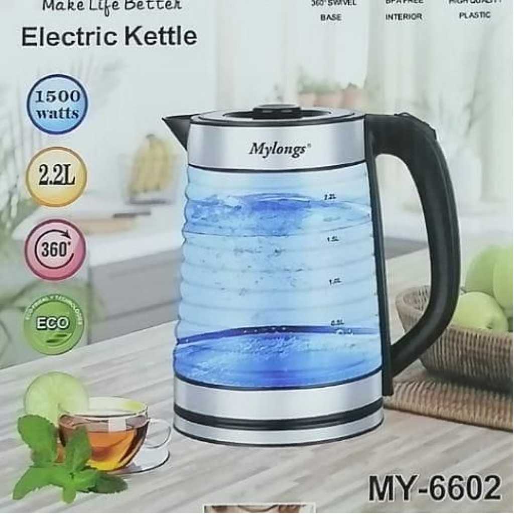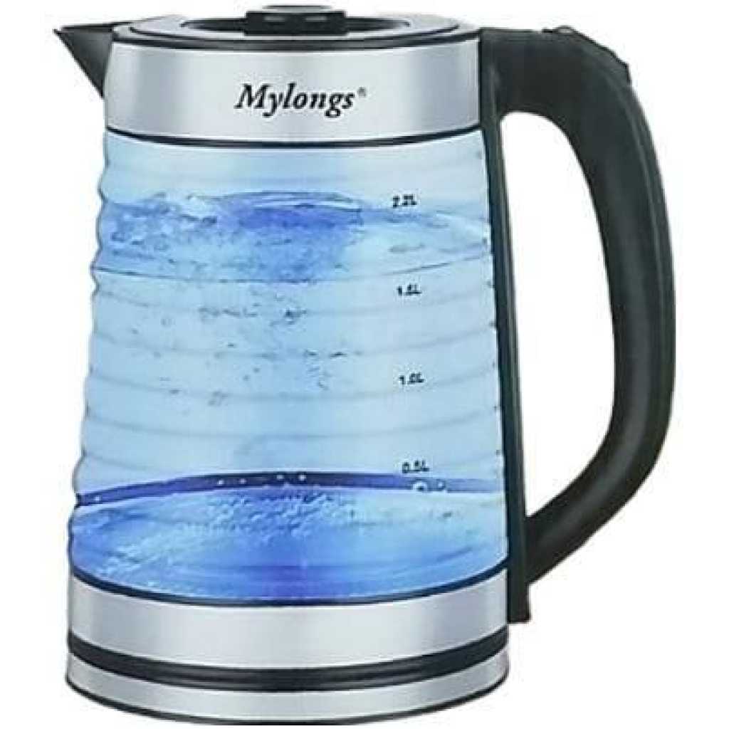 Key Features: Mylongs Electric 2.2L BPA Free Glass Kettle Cordless 360° Base, Stylish Blue LED Interior, Handy Auto Shut-Off Function – Quickly Boil Water For Tea and more, Stainless Steel 2.2-liter capacity glass kettle with blue LED illuminated interior. Voltage: 120 V Auto Shut-Off when kettle reaches a boil or runs out of water Large pouring spout with mesh filter for perfect, spill-proof pours 360-degree swivel base with wrap-around cord storage Convenient on/off switch to quickly boil up to 2.2-liter of water Concealed heating element to quickly and safely boil hot water for a variety of uses Exterior water level indicator for convenient filling
