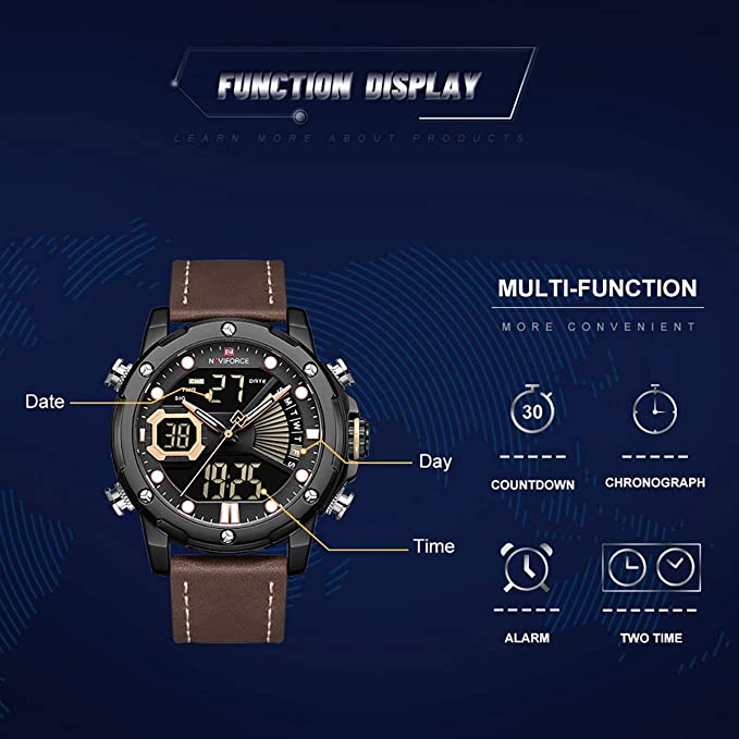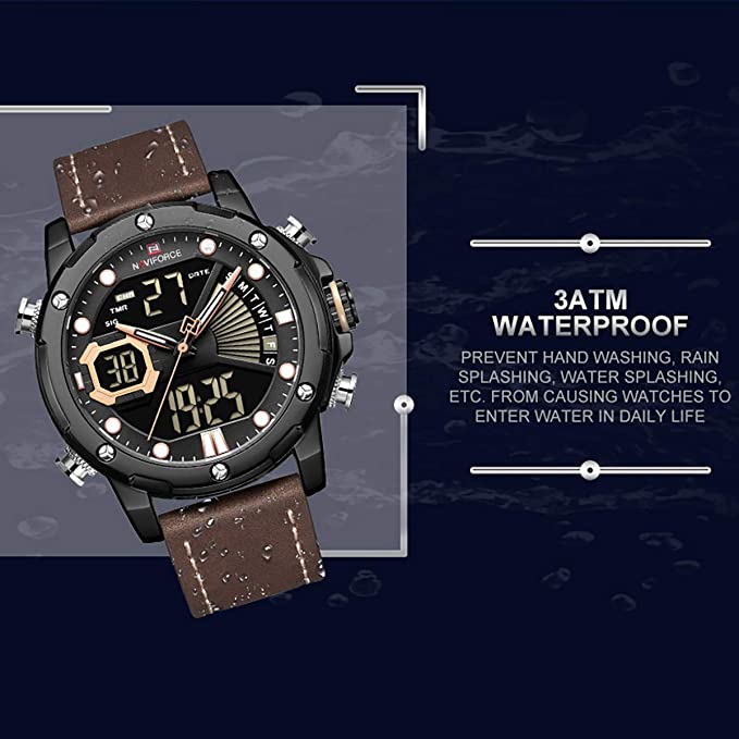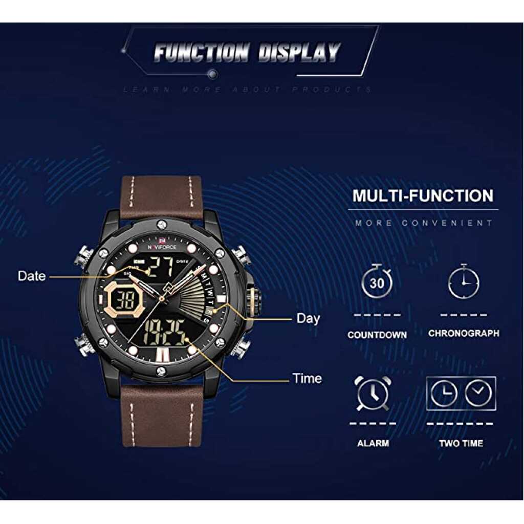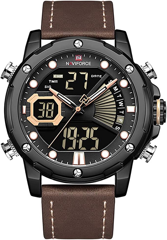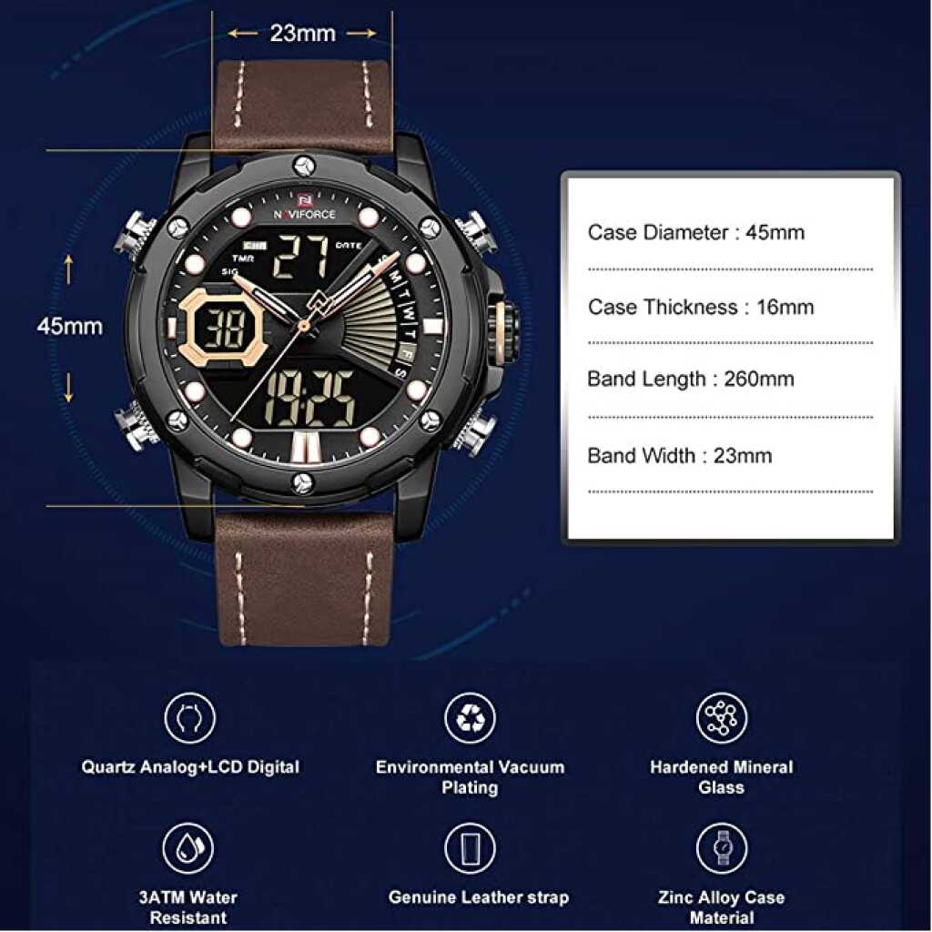 NAVIFORCE 9172 Men’s Watch – Business Fashion Luxury – Digital Quartz Dual Time Display – Casual Japanese Quartz Watches. Brand Name: NAVIFORCE Style: Fashion & Casual Clasp Type: Buckle Water Resistance Depth: 3Bar Movement: Dual Display Movement: QUARTZ Case Material: Stainless Steel Band Length: 26cm Dial Window Material Type: Hardlex Case Thickness: 16mm Band Width: 23mm Case Shape: Round Item Type: Quartz Wristwatches Boxes & Cases Material: No package Model Number: NF-9172 Band Material Type: Leather Feature: Shock Resistant Feature: Luminous Hands Feature: Stop Watch Feature: LED display Feature: Auto Date Feature: Week Display Feature: Water Resistant Feature: Chronograph Feature: Back Light Feature: Alarm Dial Diameter: 45mm Key Features: NAVIFORCE 9172 Men’s Watch – Business Fashion Luxury – Digital Quartz Dual Time Display – Casual Japanese Quartz Watches. [DIGITAL MULTIFUNCTIONAL] * Analog-digital Dual Display, 1/100-Second Stopwatch, LED Display?Week Display, Day and Date, Luminous Hands, Complete Calendar, Shock Resistant [IMPORTED MOVEMENT] * Reliable Japanese Miyota Quartz Movement, Ensure Precise Time Keeping ±1s Deviation Per Day. [Waterproof to 30M/99feet/3ATM] * In general, Withstands Rain And Splashes Of Water, But Not Swimming Or Submersion [SIZE RANGE & SPECIFICATION]*Case Material: Stainless Steel,Band Material Type: Leather,Dial Diameter: 45mm,Case Thickness: 16mm,Band Length: 260mm,Band Width: 23mm [CUSTOMER SERVICE] * We offer 60 Days of Free Replacement (or FULL Refund) And 1 Year After Sales Service For Watches.