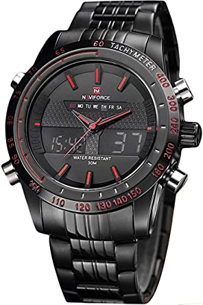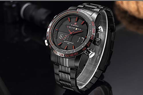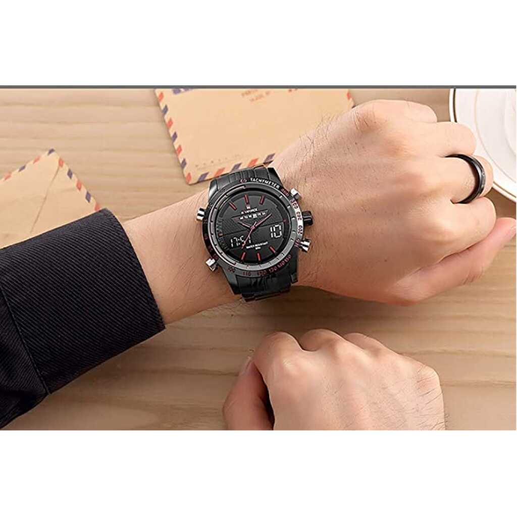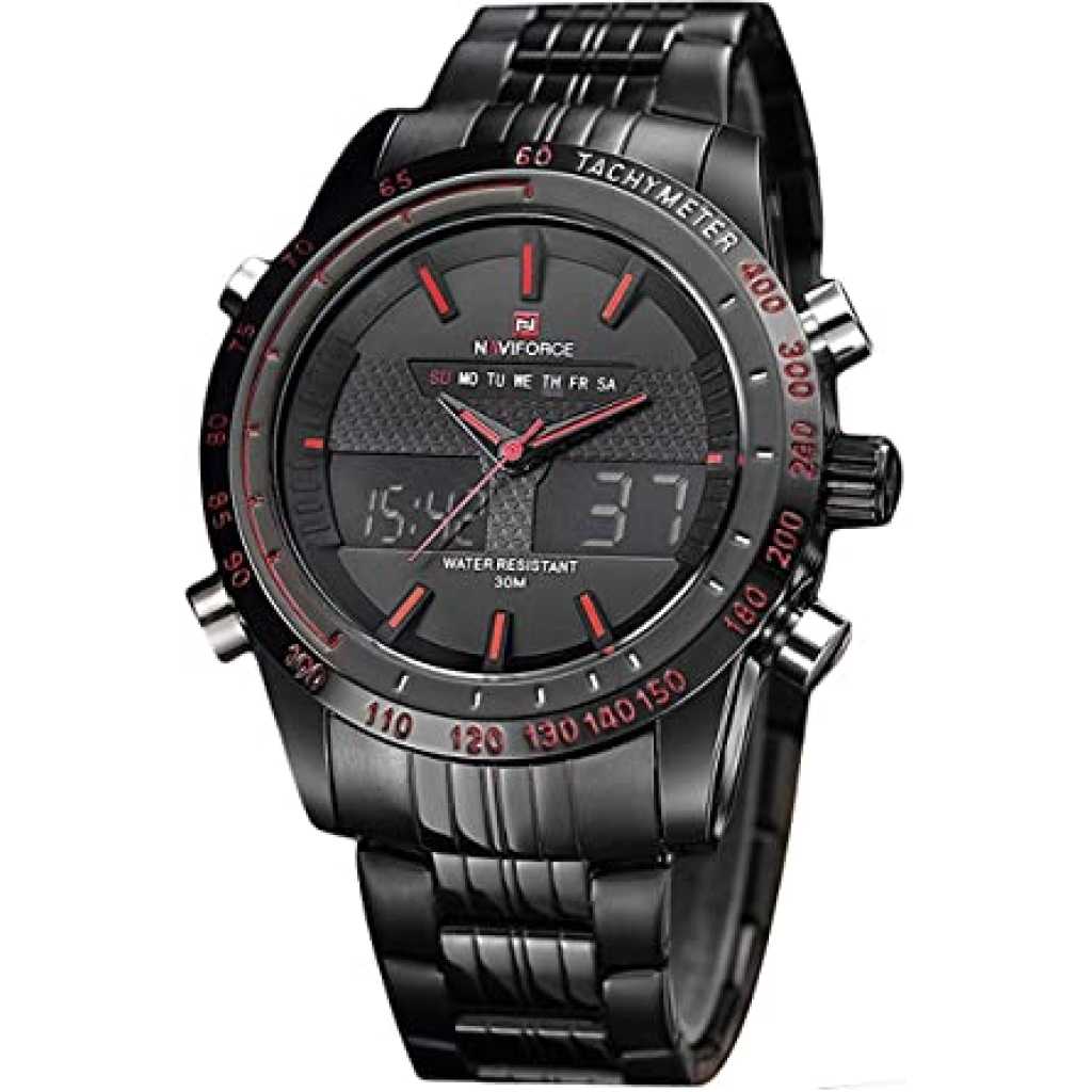 Naviforce Analog-Digital Dual Display Men’s Watch – NF9024-BBR. Naviforce Analog-Digital Black Dial Men’s Watch-NF9024-BBR By LexXiv Dial Color: Black, Case Shape: Round, Dial Glass Material: Glass Band Color: Black, Band Material: Metal Watch Movement Type: Quartz, Watch Display Type: Analog-Digital Case Material: Metal, Case Diameter: 46 millimeters Water Resistance Depth: 30 meters 1-year warranty Original Japan Seiko AL21E4 quartz movement and LCD 6 digits movement, guarantees precise and punctual time Japanese quartz movement with analog-digital display, precise and accurate timekeeping, day, date, and time display. Multi-function: Waterproof, alarm function, stopwatch, 1/100 chronograph, alarm, snooze, hourly chime, and auto date with stable LED display,dual-time display with EL backlight, luminous hands, and hour markers, easy to read in the dark. Plating wear-resistant stainless steel case, high transparent mineral glass for scratch resistance. Flexible stainless steel watch band with push-button-clasp closure. Water resistant to 3 ATM (30 M): Washing hands, raining or splashing, daily use waterproof. Not suitable for swimming, diving, shower. As a Gift – As a gift for friends, families, and colleagues on Father’s Day, Birthdays, and more.
