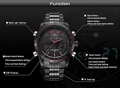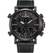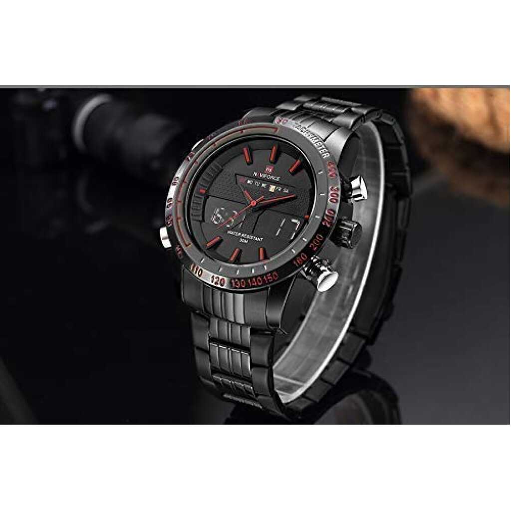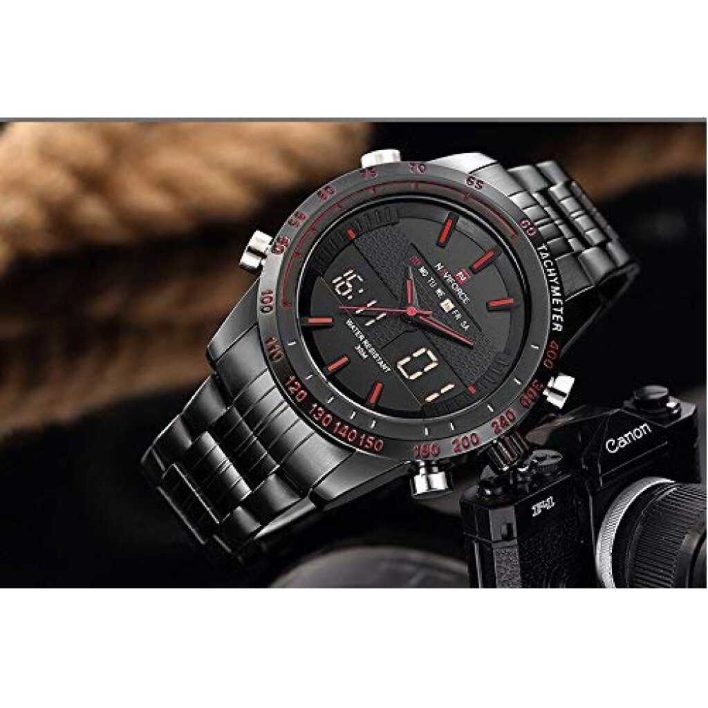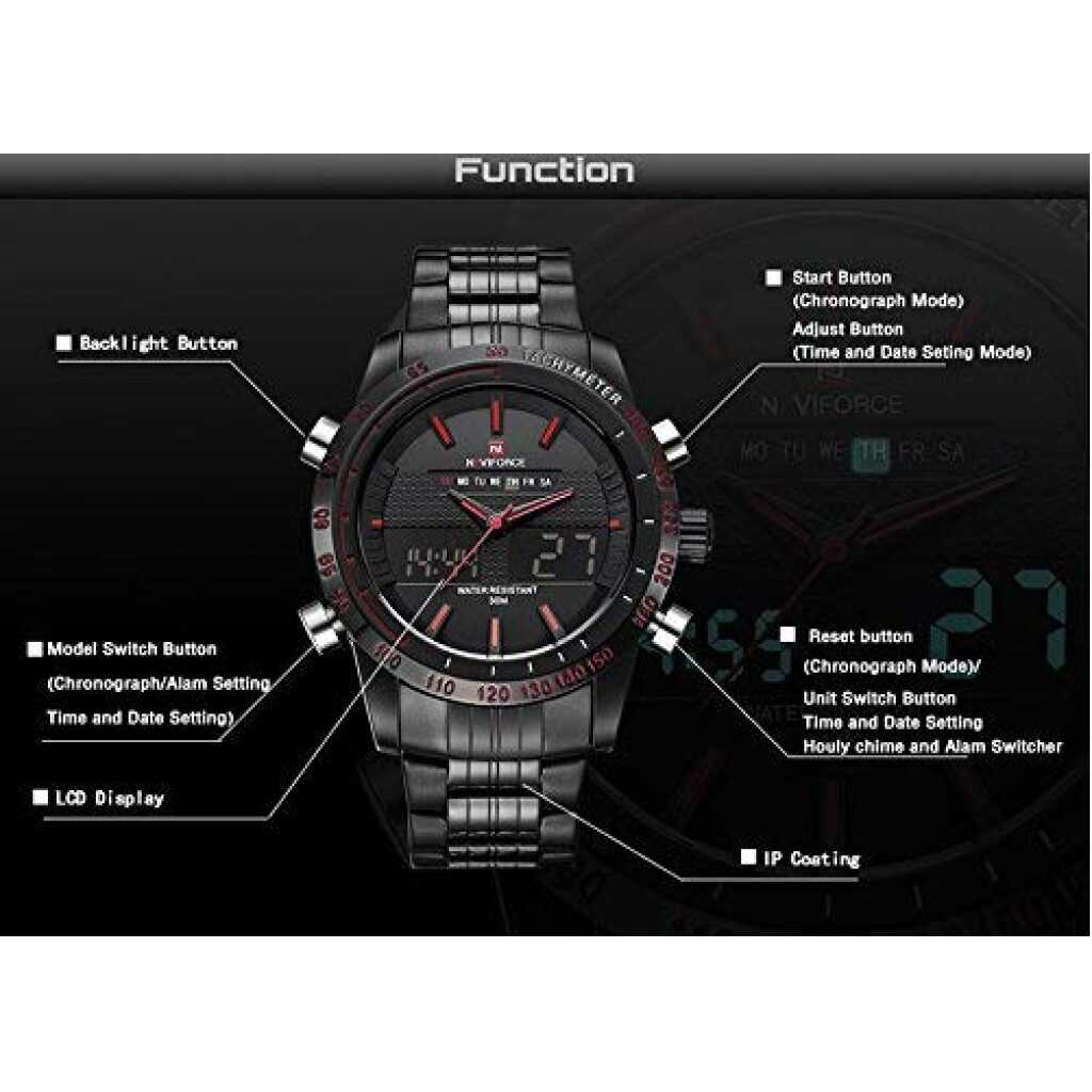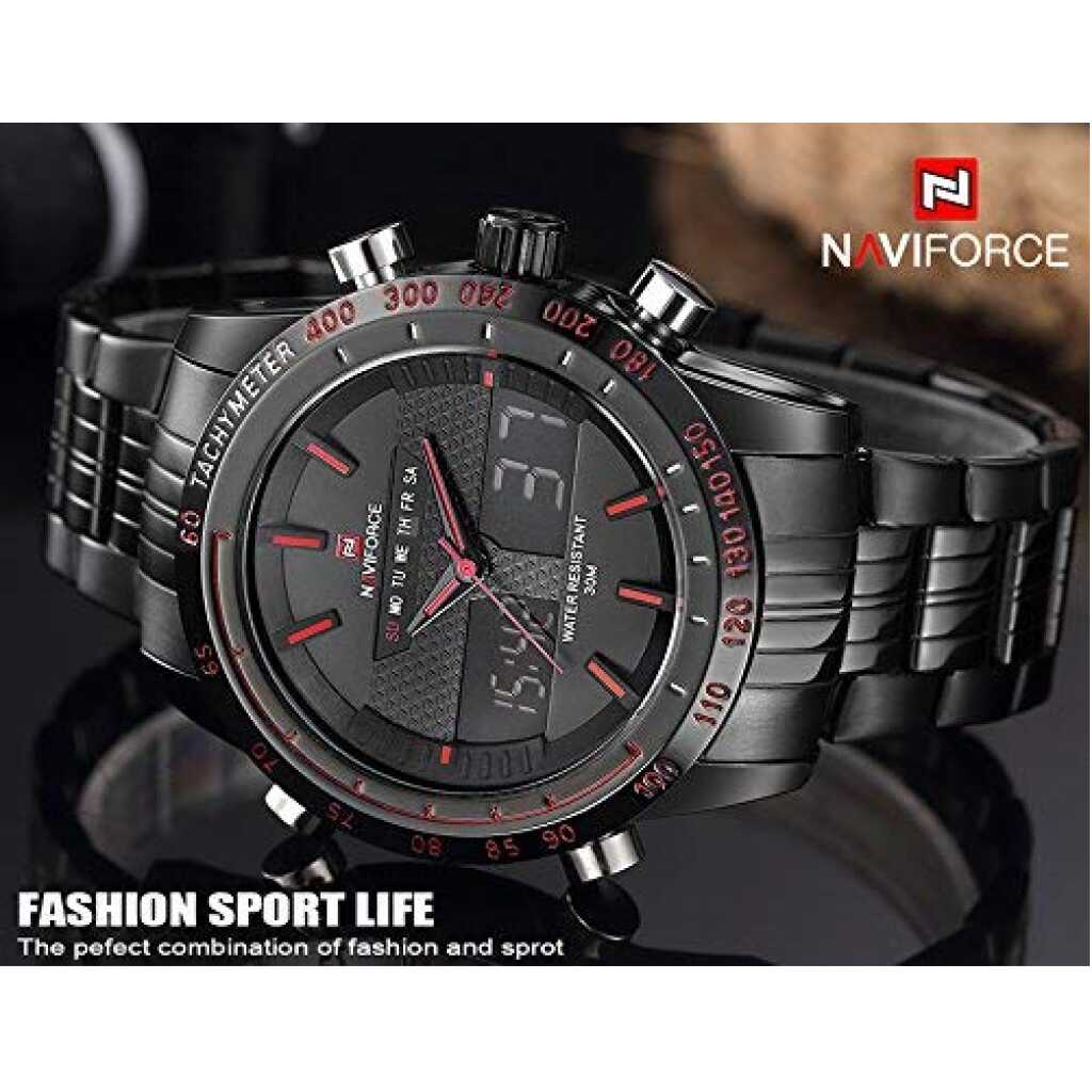 Key Features: Naviforce Analog-Digital Dual Display Men’s Watch – NF9024-BBR. Dial Color: Black, Case Shape: Round, Dial Glass Material: Glass Band Color: Black, Band Material: Metal Watch Movement Type: Quartz, Watch Display Type: Analog-Digital Case Material: Metal, Case Diameter: 46 millimeters Water Resistance Depth: 30 meters 1-year warranty Original Japan Seiko AL21E4 quartz movement and LCD 6 digits movement, guarantees precise and punctual time