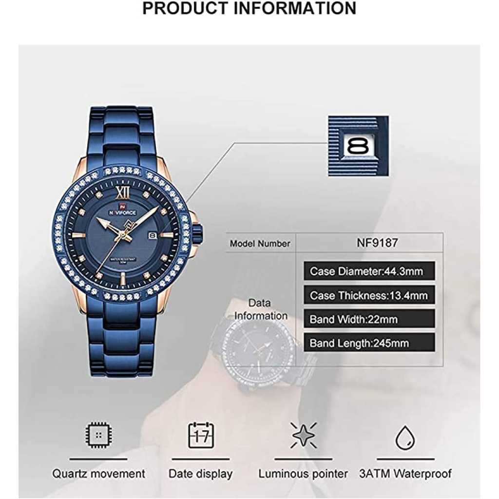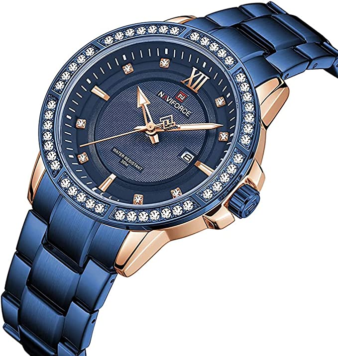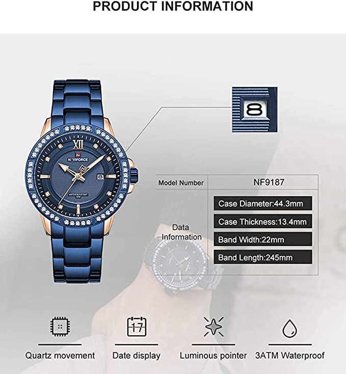 Key Features: NAVIFORCE Diamond Stainless Steel Analog Quartz Watches for Men Waterproof Watch. Japanese quartz movement: High quality Japanese quartz movement which can provide precise timekeeping, including the date display. 3ATM waterproof: Experimentally certified 3ATM waterproof, give your watch water droplets isolation and rain resistance. But please note that do not wear it in your bathing, swimming, or diving. High-quality materials: There is a high-strength mineral glass on the case which can offer scratch protection. The stainless steel band is comfortable on your wrist, durable and adjustable, which is great for daily wear. High-quality materials: The top quality and flexible stainless steel watch band, by IP plated technology, roman numeral and shiny diamond on the watch dial, show special gentleman taste. GIFT: Wristwatches for men is the perfect gift for festivals, families, and meetings. Quartz watches are a luxurious fashion gift for graduation, birthday, wedding, and valentine’s day!