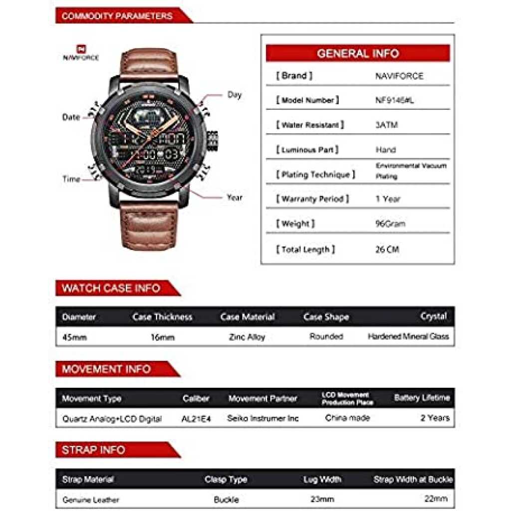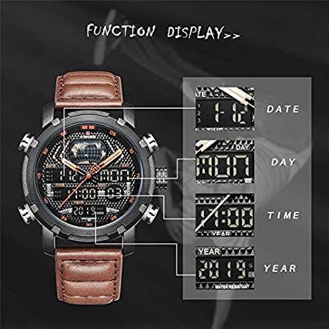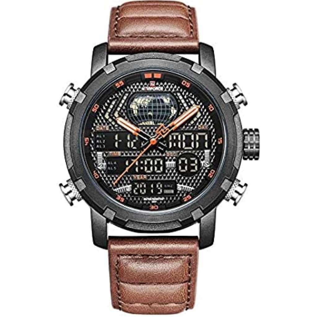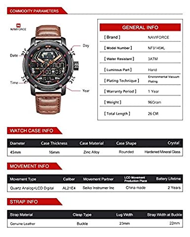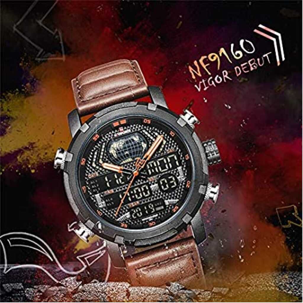 Naviforce Duel Display Chronograph Date Military Digital Analog Sport Men’s Wrist Watches -NF9160. NAVIFORCE 9160 Fashion Men Sport Chronograph Analog Digital Duel Display Watches Men’s Army Military Steel Quartz Watch We are the only seller selling Naviforce watches with Original watch packaging. We are an Authorised Distributor of the Naviforce Brand. ABOUT BRAND: Established back in 2012 in Guangzhou, NAVIFORCE has grown to be one of the best watch manufacturers as well as a popular brand recognized abroad. Just as its name suggests (combined with “Navy” and “Force”), NAVIFORCE aims to become the Navy Seal in the watch industry. “Personality & durability” – the design soul of NAVIFORCE has well interpreted the founder’s design philosophy. To create a personality from its appearance, and challenge the durability from its quality. Each watch of NAVIFORCE demonstrates the unremitting pursuit of unique design, exquisite craftsmanship, and perfect user experience Key Features: Naviforce Dual Display Chronograph Date Military Digital Analog Sport Men’s Wrist Watches -NF9160. New and high-quality Genuine Brand comes in an Original Box. This classic watch, has date and Week functions, a precise movement display, and a multi-function display. The perfect combination of fashion and sport. The leather band ensures comfortable touch, a chic look, and a strong performance. Mineral reinforced mirror, high-end steel strap, anti-scratch, and wear-resistant, classic and stylish appearance, never out of time Please check the Images for a complete description. Quartz movement, making sure you have the most precise time in hand. Features: Water Resistant, Auto Date, Week, Display, Leisure Army Military design Men’s watch 3ATM water resistance, prevent accidental contact with water, such as rainwater splash or washing hands (Please don’t press any key underwater)