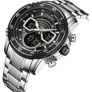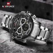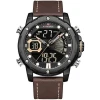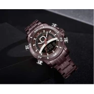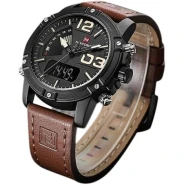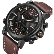 It’s a Naviforce dual leather Strapped digital and analog waterproof men’s luxury designer watch. This watch is made of brown leather straps and a black circular face. Key Features: Brand Naviforce Color brown Waterproof Back light Digital and analog