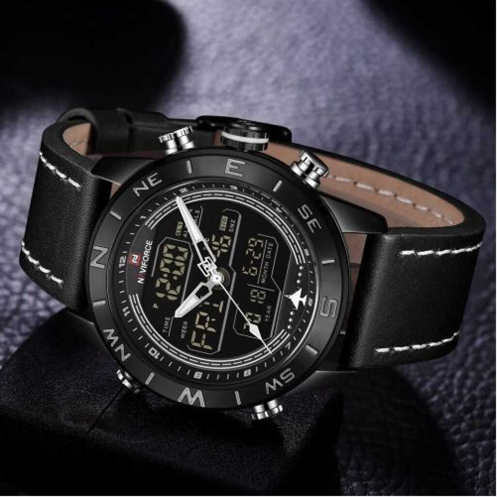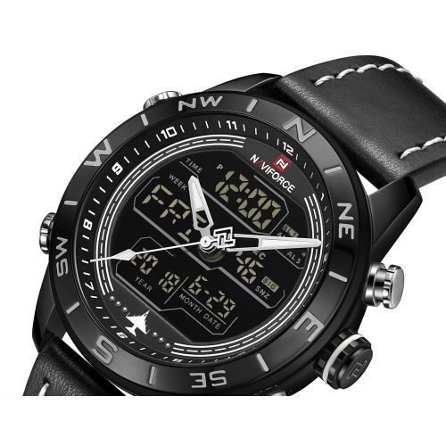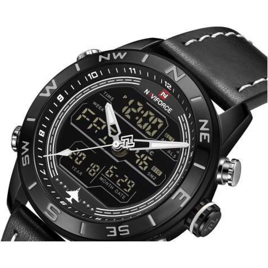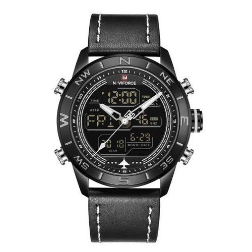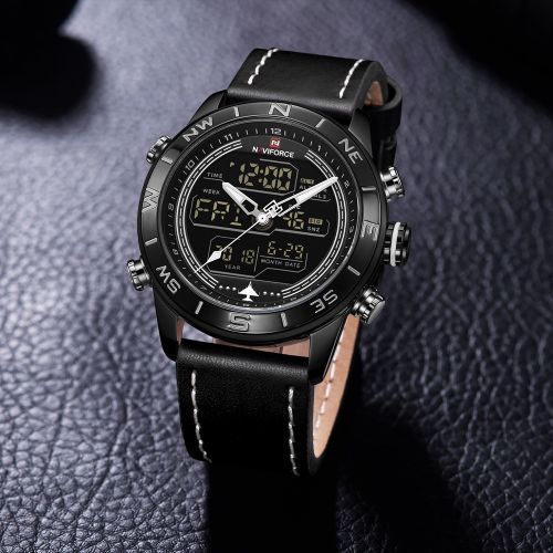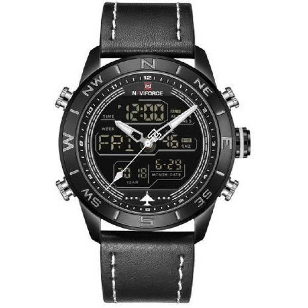 Naviforce Men’s Dual Display Leather Straps Designer Watch – Black. This Watch is crafted with precision for an elegant update to your accessories. It embodies a classic style with a color to suit everyone. This watch is ideal for ensuring every outfit is effortless and stylish. Buy this from TilyExpress Uganda at the best price and have it delivered right to your doorstep. Description: – 100% New and high quality – Alarm output with 4 min, Snooze – Day, Date, and Time Display – Crime on every hour – Stopwatch with and 1/100 lap operation – Dual Core – Analog and Digital display – EL (Blue) function – Hourly chime function – PU Leather band – Water Resistant Specifications: – Case Material: Stainless Steel – Case Diameter: 45mm – Case Thickness: 15mm – Band Material: Leather Band – Band Length (include Case): 260mm – Band Width: 23mm – Weight: 92g What’s Included: – 1 x Watch Key Features: Naviforce Men’s Dual Display Leather Straps Designer Watch. Color: Black. Gender: Men. Strap Material: PU Leather. Brand: Naviforce. 100% New and high quality.