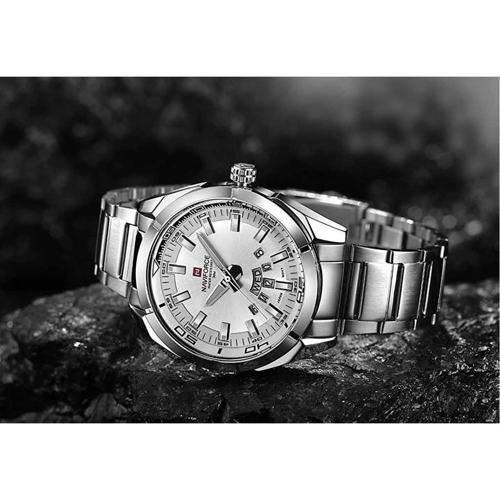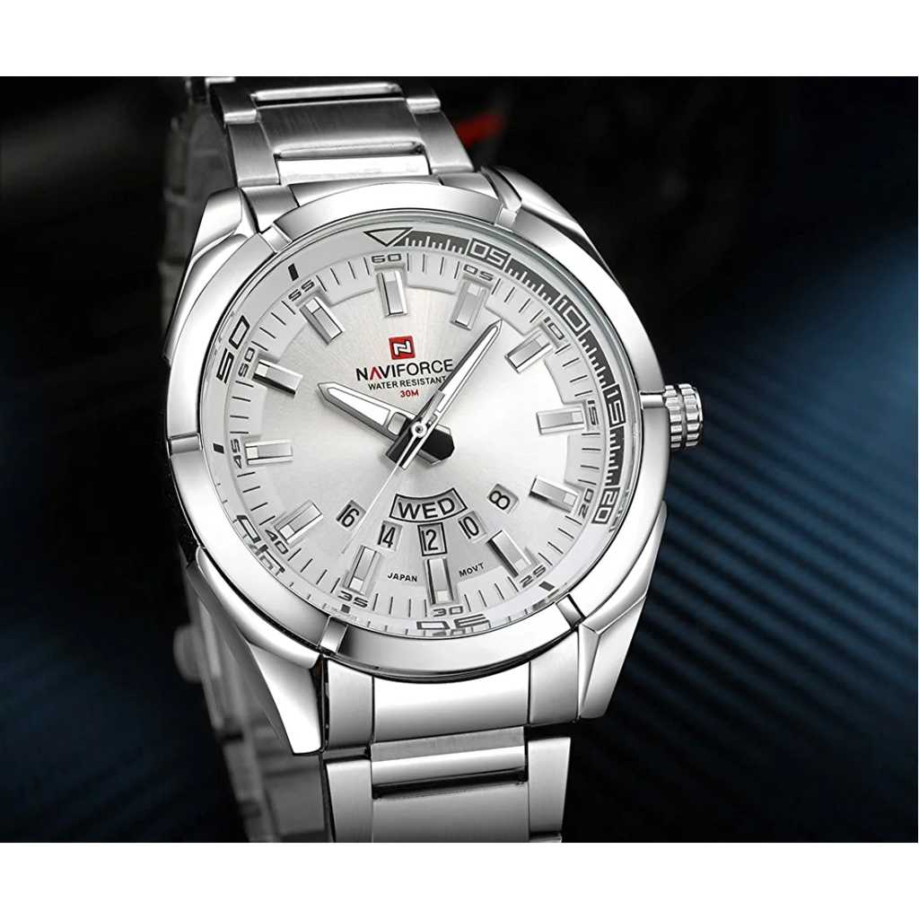 NAVIFORCE Men’s Sports Watches Waterproof Military Quartz Leather Strap Date Wrist Watch – Silver. Features: Imported Japanese movement provides precise and accurate time keeping. Time and week and date display, stylish and precise scale on the dial makes it more luxurious. Durable stainless steel back and watch strap, double deployment clasp. Luminous hands and easy to read time Water resistant to 30 meters, ideal for business, casual, indoor activities and daily use. Material: Case Material: Stainless Steel Band Material: Stainless Steel Mirror Surface: High Hardness Mineral Glass (Scratch Resistant) Specification: Band Material: Stainless Steel Case Material:Zinc Alloy Band Width:2cm Case Thickness: 1.2cm Case Diameter:4.5cm Maximum fit wrist diameter: 7 cm. Buckle: double locking, fold-over clasp. Product weight: 120g Battery Code: Seiko626 Note: Please DO NOT PULL OUT the Button Underwater. Also avoid use in extreme hot or cold temperature. If mist or droplets found inside watch surface, please contact us immediately for maintenance to prevent moisture corrosion of the internal components. Clean the strap by a soft cloth on regular bases is highly recommended. Too much water contact will shorter watch life.