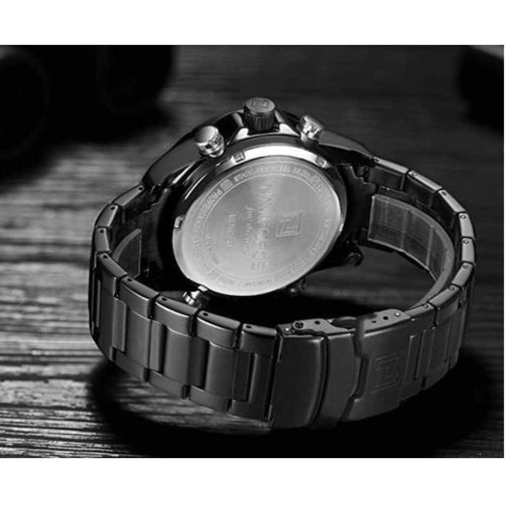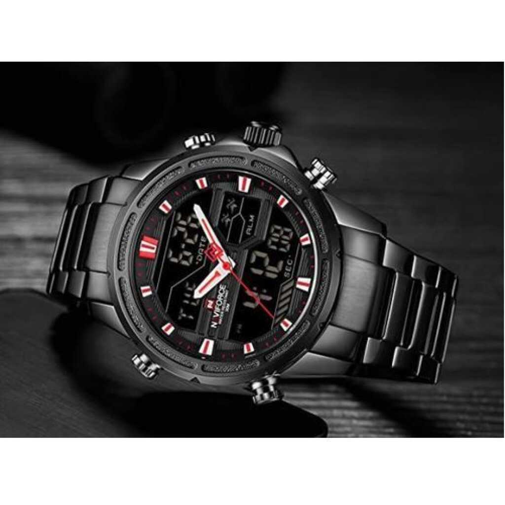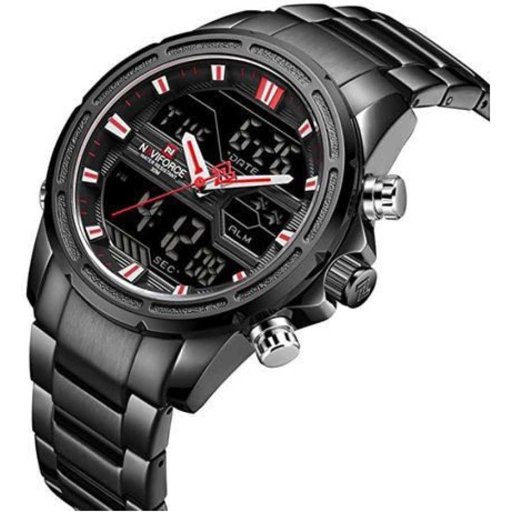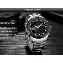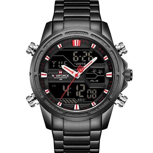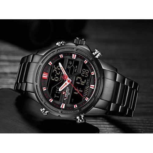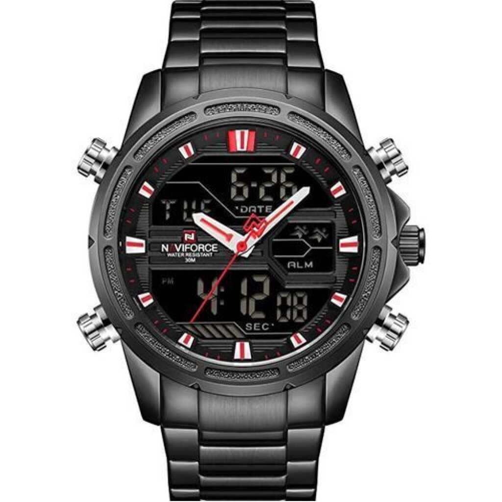 Naviforce Men’s Stainless Steel Quartz Digital Sport Watch – Black. Brand: Naviforce Model Number: NF9138S Water Resistant: 3ATM Luminous Part: Plating Technique: Environmental vacuum electroplating Warranty Period: 1 year Weight: 177g Total Length:24.5cm Case Diameter: 45 mm Case Thickness: 17mm Case Material: Zinc alloy Case Shape: Round Crystal: Reinforced mineral glass Movement Type: Electronic LCD & Multi-function quartz movement Caliber: AL21E4 Movement Partner: Japanese Seiko Battery Lifetime: 2 years Strap Material: Stainless steel Clasp Type: folding clasp with safety Lug Width: 24mm Strap Width at Buckle: 22mm