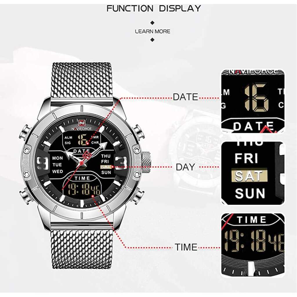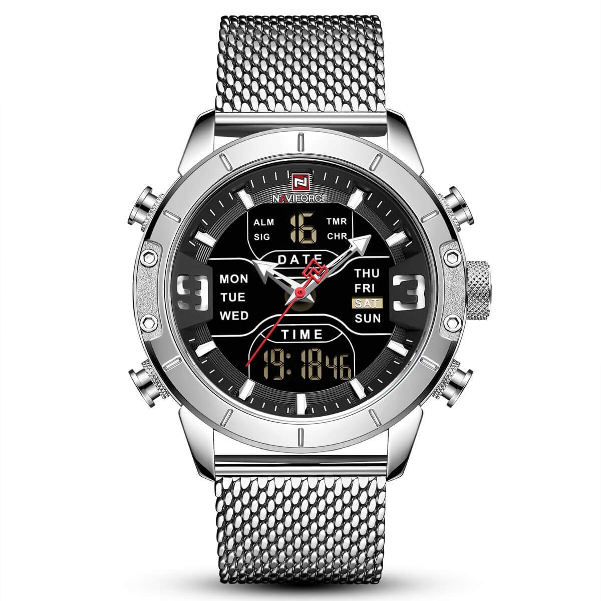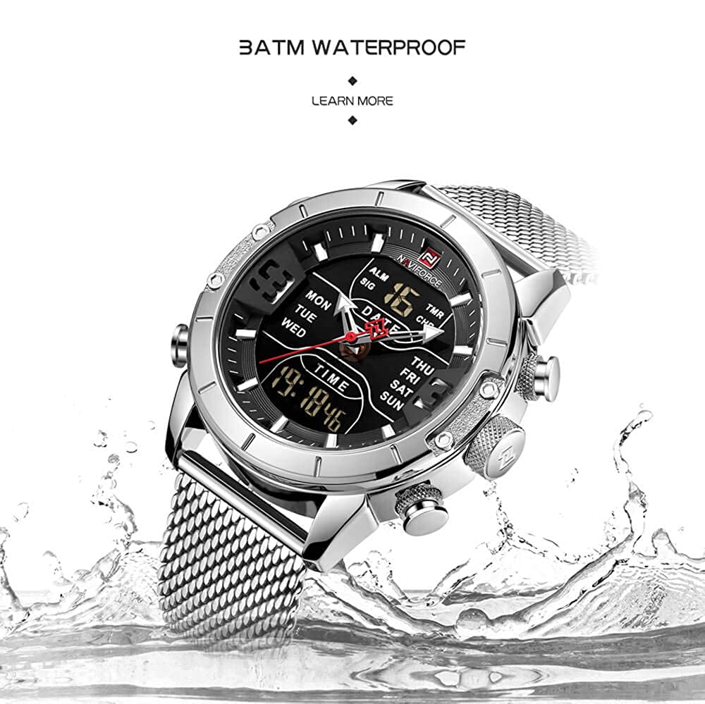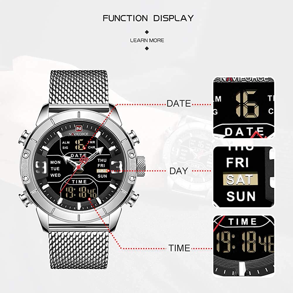 NAVIFORCE Men's Watch Waterproof Multifunction LED Digital Quartz Wrist Watches Stainless Steel Mesh Strap