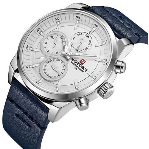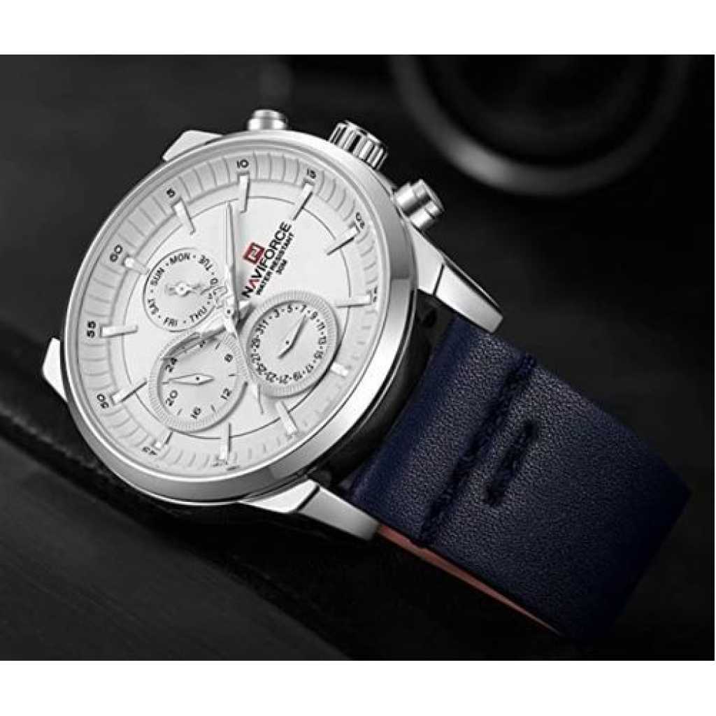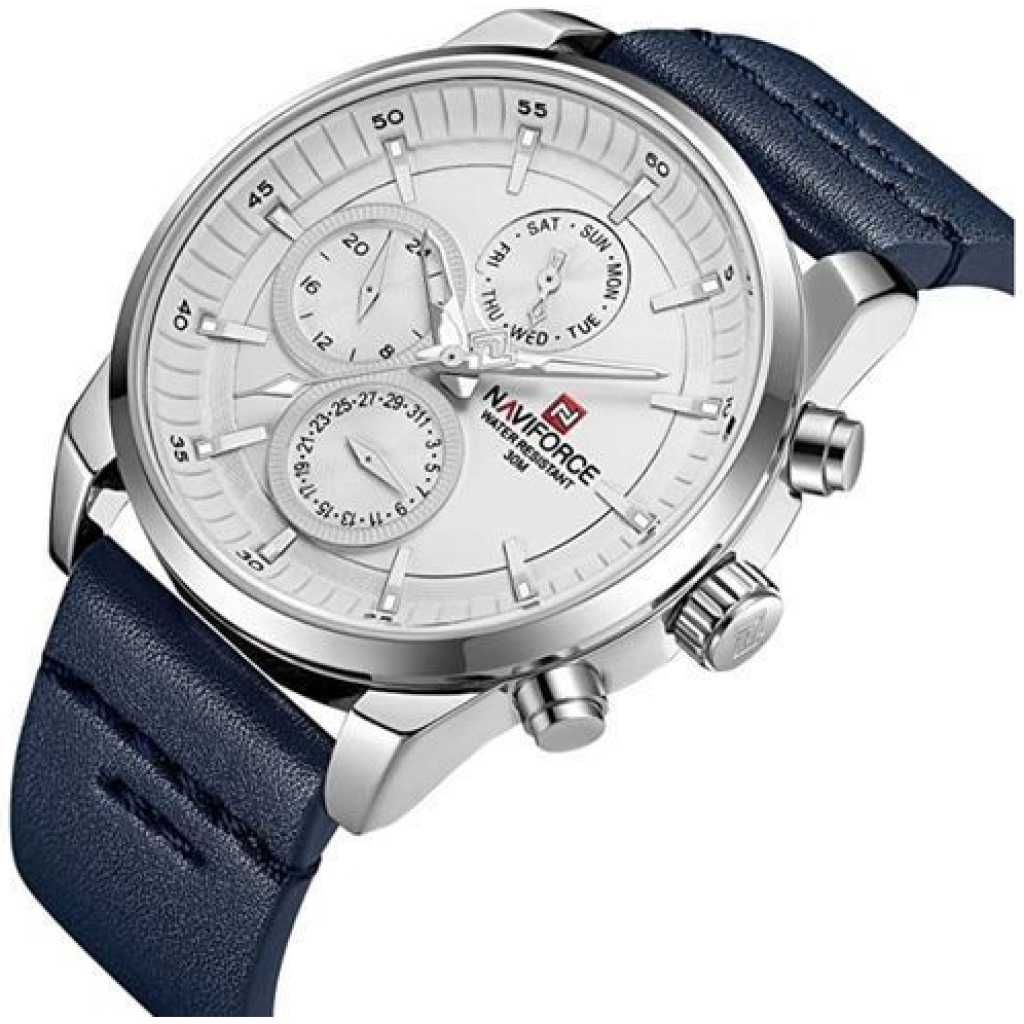 Naviforce NF9148 – Men’s Designer Leather Strap Watch – Blue. Functions:- 24 Hour Display;- Calendar (Day And Date Display);- Analogue Quartz Movement;- Water Resistance: 30M/3ATM; Specifications:- Dial diameter: Approx. 45 mm (1.77 inch);- Dial thickness: Approx. 12 mm(0.47 inch);- Band width: Approx. 24 mm(0.94 inch);- Watch length: 260 mm(10.24 inch);- Fit wrist: Approx. 16-22.0 cm (6.3 inch-8.66 inch); Details:- Movement: Seiko Quartz Movement;- Case Material: Zinc Alloy;- Case Shape: Round;- Dial Window Material: Hardened Mineral Glass;- Dial Material: Acrylic;- Dial Display: Analogue;- Band Material: Genuine Leather;- Water Resistance: 30m (Do not adjust time under water);- Battery Life: 18 months under normal circumstances;- Net Weight: 66g; Package includes:1* NAVIFORCE Wrist Watch for Men; Key Features: Naviforce NF9148 – Men’s Designer Leather Strap Watch – Blue. Brand Name: NAVIFORCE Model number: 9148 Model Year: 2019 Item Shape: Round Band Material: Leather Band Length: Men’s Standard