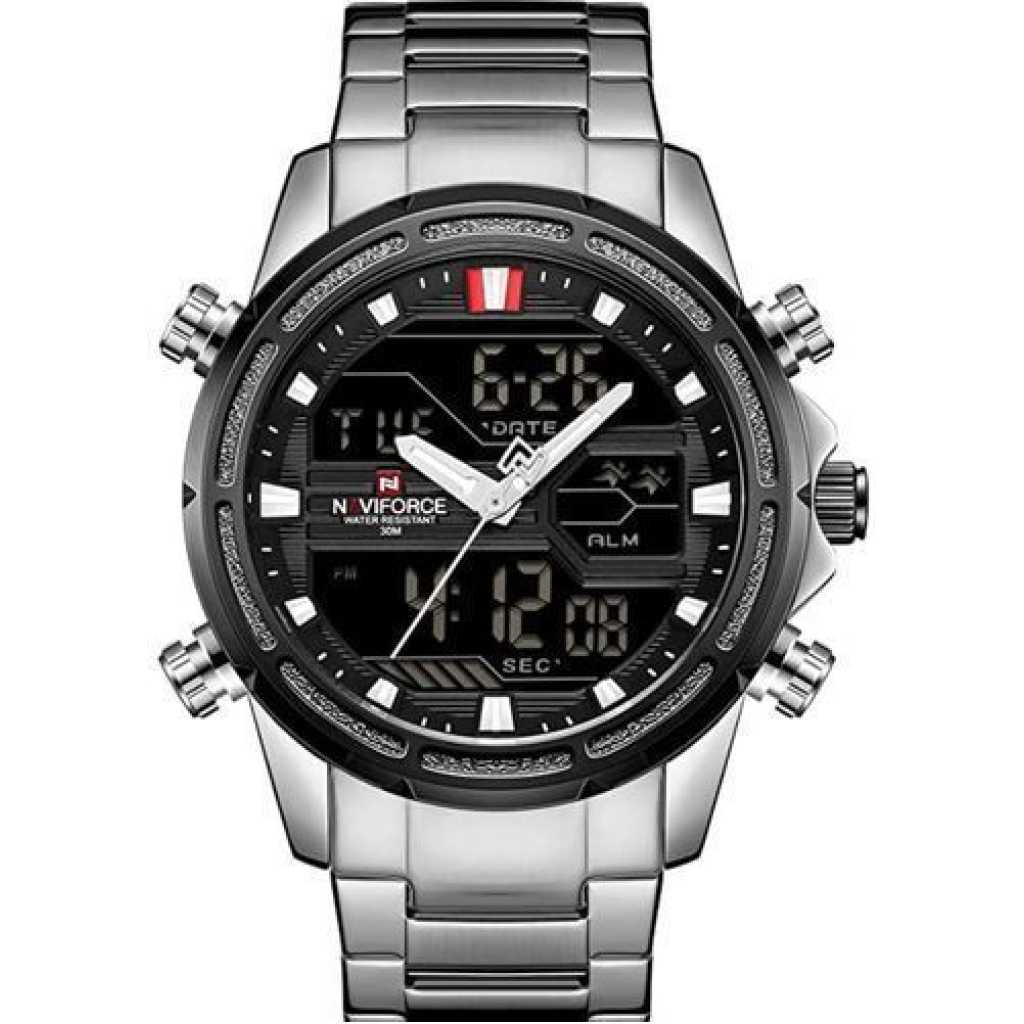 Key Features: Naviforce Stainless Steel Analog And Digital Water Proof Men’s Watch – Silver. Color: Silver. Strap Material: Stainless steel. Display Type: Analog. Closure: Folding clasp. It’s waterproof.