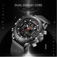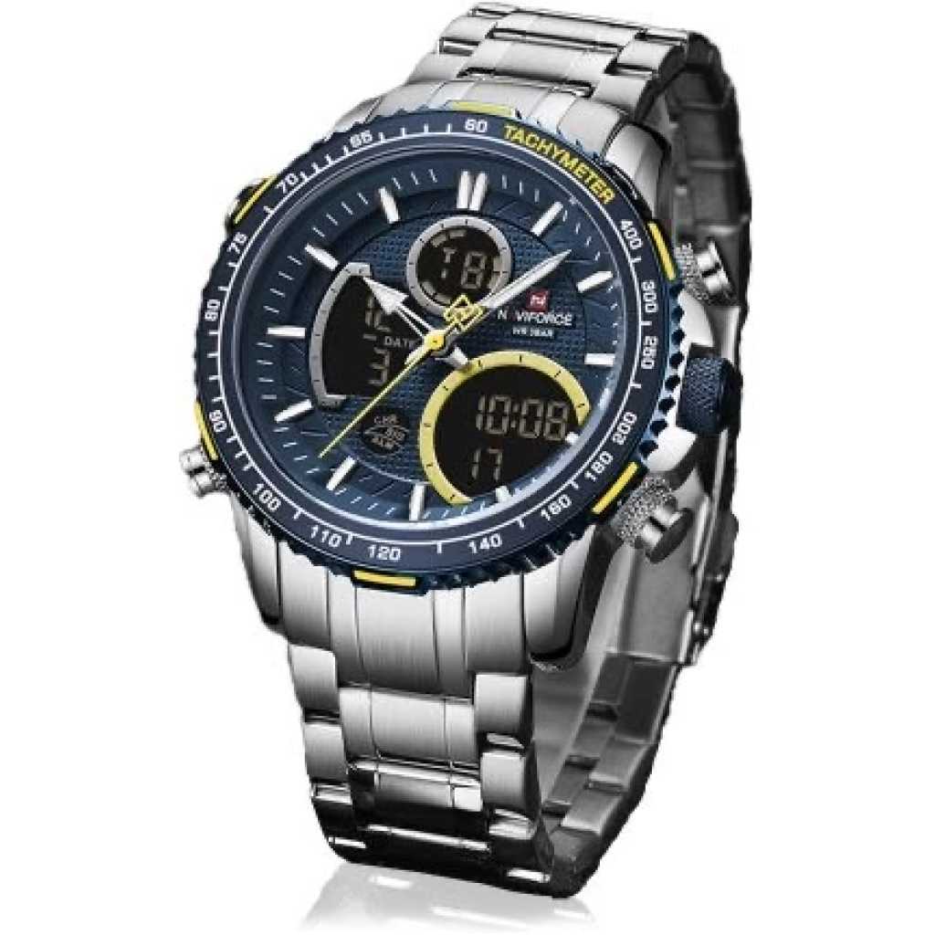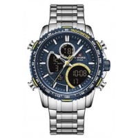 It’s a naviforce waterproof stainless steel digital and analog men’s luxury designer watch silver. It’s made of a stainless steel adjustable chain. It also a back light on the digital mode which helps you tell time anytime of the day. Key Features: Naviforce Stainless steel Digital Analog Silver Date display