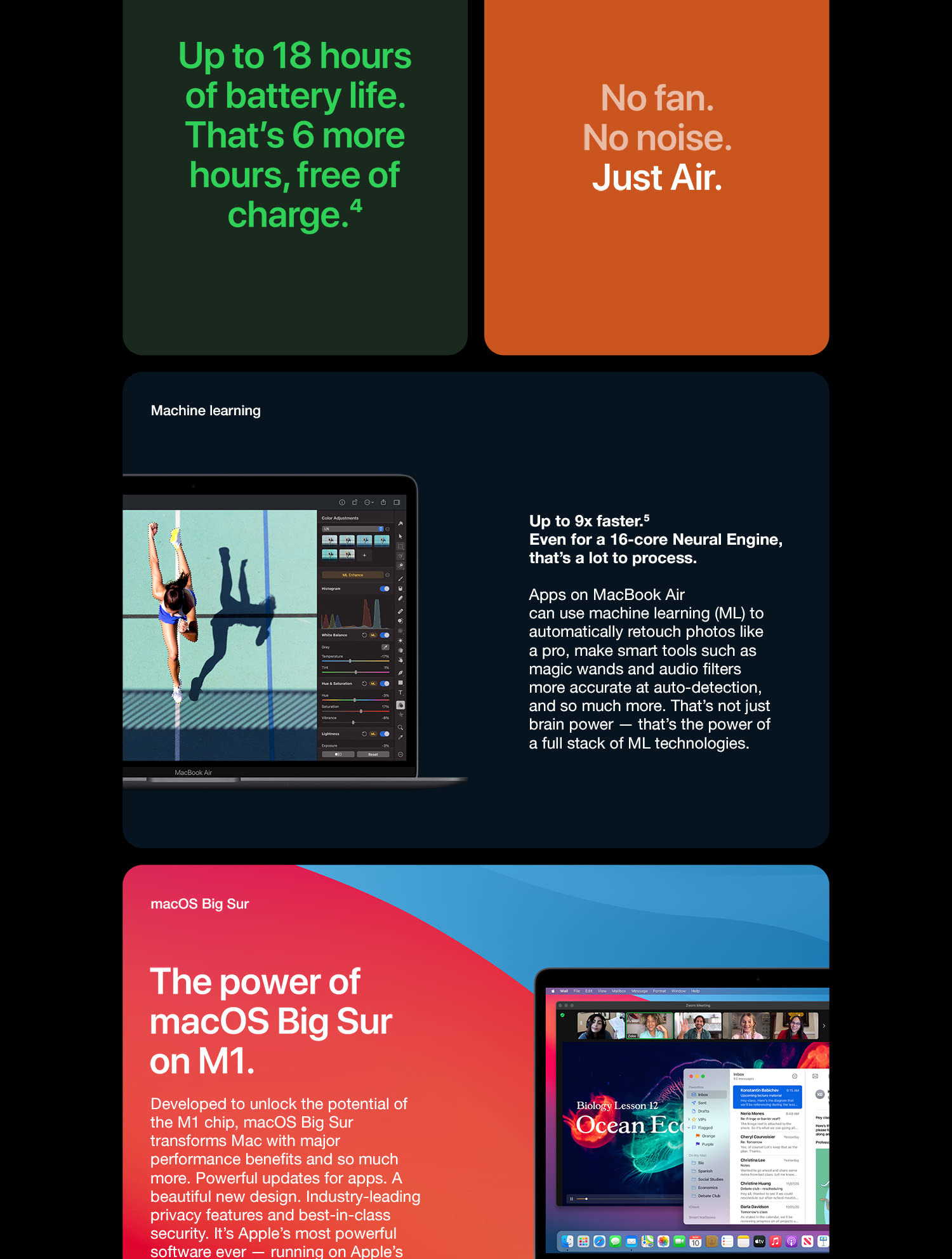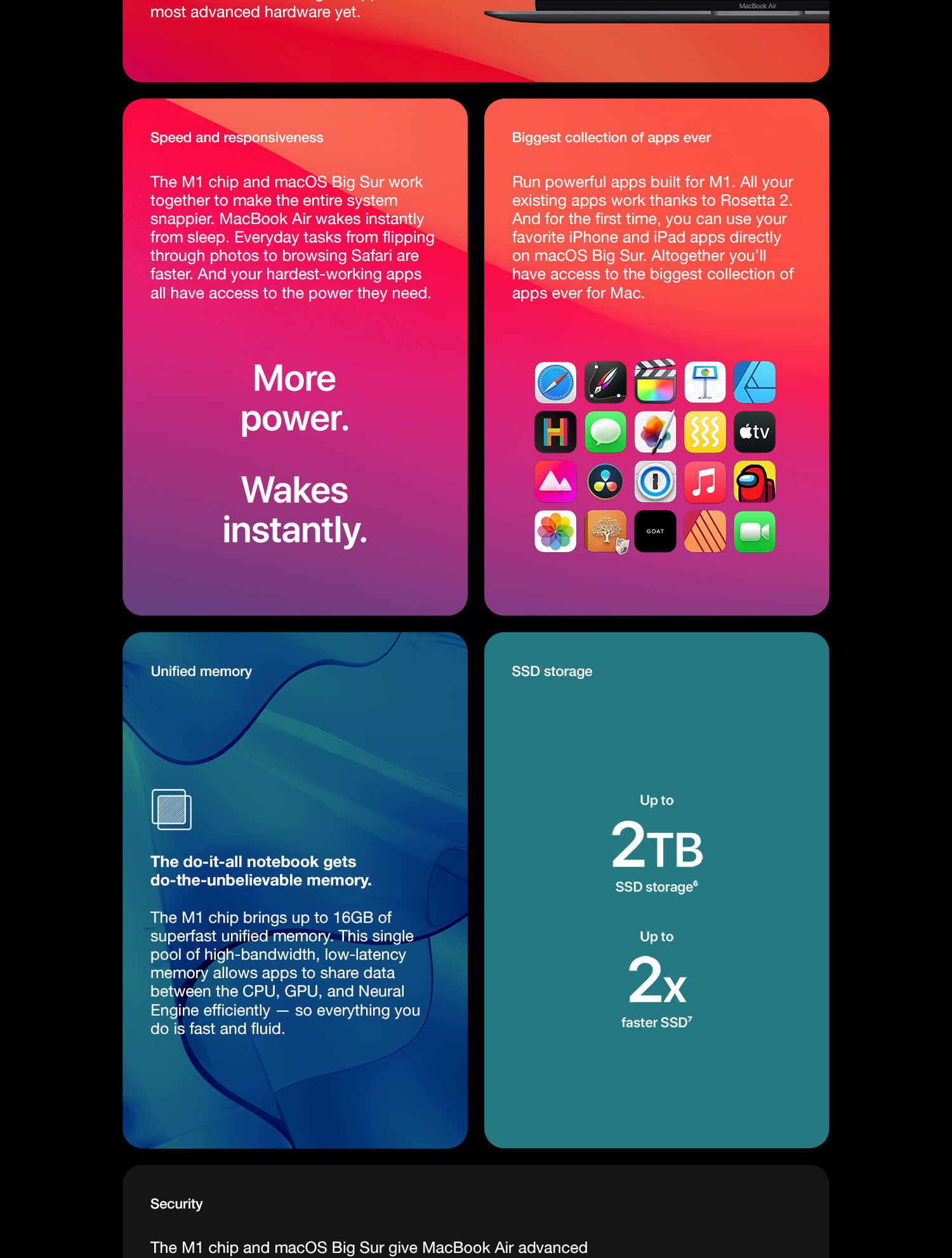 The incredibly thin and light MacBook Air is now more powerful than ever. It features a brilliant Retina display, new Magic Keyboard, Touch ID, processors with up to twice the performance,1 faster graphics, and double the storage capacity. The sleek wedge-shaped design is created from 100 percent recycled aluminum, making it the greenest Mac ever.2 And with all-day battery life, our most popular Mac is your perfectly portable, do-it-all notebook. With a resolution of 2560-by-1600 for over 4 million pixels, the results are positively jaw dropping. Images take on a new level of detail and realism. Text is sharp and clear. And True Tone technology automatically adjusts the white point of the display to match the color temperature of your environment — making web pages and email look as natural as the printed page. With millions of colors, everything you see is rich and vibrant. The display glass goes right to the edge of the enclosure, so you can focus on what’s on your screen. And you’re going to love what you see. The advanced security and convenience of Touch ID are built right into MacBook Air. Simply place your finger on the Touch ID sensor and — just like that — your Mac unlocks. Use your fingerprint to immediately access locked documents