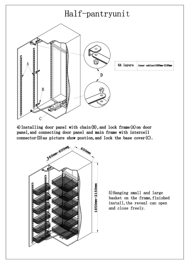 Don’t have space for a walk-in pantry? Newmatic has you covered with the BK7360 Pull-Out Pantry, which is constructed of durable chrome steel and boasts six detachable shelves to store your groceries. The pantry also has a modern primary color finish. Optimize your kitchen with Newmatic kitchen hardware today. This product is designed to be installed in a kitchen cabinet. Pair with other Newmatic kitchen appliances and hardware for the perfect kitchen system. Suggested Cabinet Width – 600mm Materials Stainless Steel with a Primary Color Finish Levels 6 Dimensions Suggested Cabinet Dimensions W56.4 X H(165-195)cm X D50 W 60cm x H 185-215cm x D 56-60cm