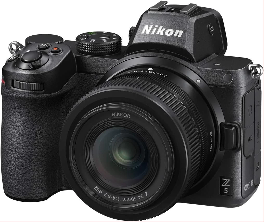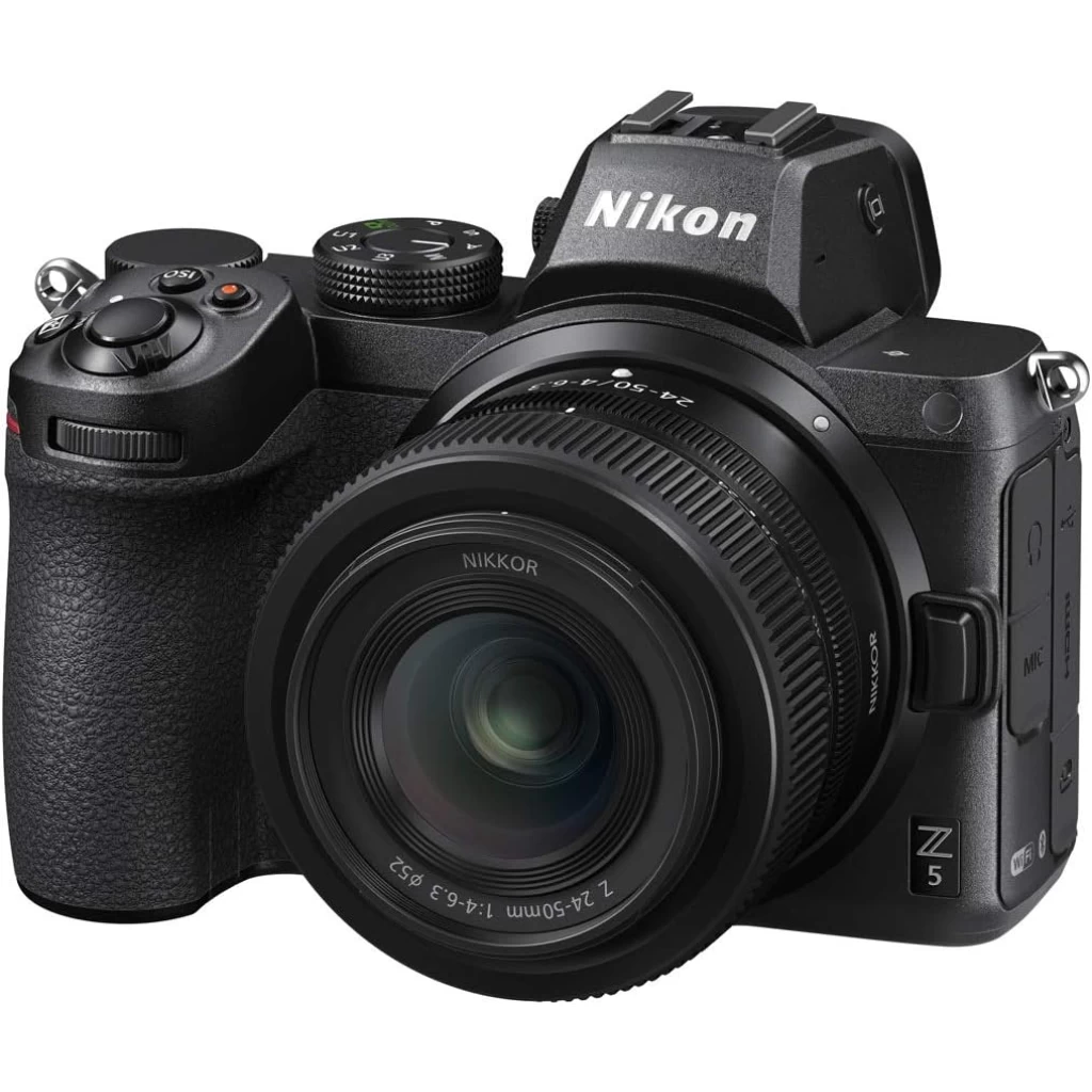 Key Features: Nikon Z5 + Z 24-50mm Mirrorless Camera Kit (273-point Hybrid AF, 5-axis in-Body Optical Image Stabilisation, 4K Movies, Dual Card Slots) – Black. Stunning Nikon Z image quality: ultra-wide Nikon Z mount, powerful EXPEED 6 processor, and full-frame 24.3 MP CMOS sensor with 100-51200 ISO range. Small kit, big impact: the super-portable NIKKOR Z 24-50mm f/4-6.3 is included in the core Z 5 camera + lens kit. 273-point Hybrid AF: delivers smooth, fast, and precise focusing across the frame. Eye-Detection AF locks on to eyes for perfect portraits of people. Animal-Detection AF does the same for cats and dogs. Ultra-sharp 3690k-dot electronic viewfinder: the high-definition EVF doesn’t leave anything out of the frame. Key settings like exposure, ISO, and white balance are applied in real time. Tough yet lightweight: the magnesium alloy body is sealed to keep dust and moisture out..Tilting touchscreen: touch to focus and shoot, and double-tap to see a 100 % view of the image area..Smooth 4K movies: NIKKOR Z full-frame lenses enable beautiful depth of field. Create eye-popping time-lapse movies in-camera, and take stills while filming..Video capture resolution: 4K UHD 2160p