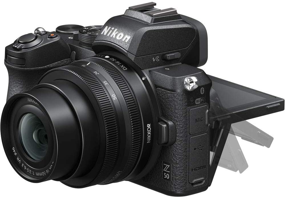 Nikon Z50 is a DX-format mirrorless digital camera revolving around the versatile Z Mount. Capable in both stills and video realms, the Z50 features a 20.9MP CMOS sensor and EXPEED 6 image processor, which enables fast performance up to 11 fps, a reliable 209-point hybrid AF system with eye detection, and notable low-light performance to ISO 51200. For video shooters, UHD 4K is supported up to 30 fps along with Full HD recording at up to 120 fps for slow-motion playback. For fine-tuning your photos and videos, in-camera clip trimming can be used, and 20 Creative Picture Controls and 10 Special Effects settings help to infuse your imagery with a unique look.The body design is impressively sleek yet still ergonomic to benefit all-day-long shooting. A high-resolution 2.36m-dot OLED EVF benefits working in bright conditions with clear eye-level viewing and the 3.2″ rear touchscreen LCD has a 180° flip-down design that is perfect for selfies. The magnesium alloy body is weather-sealed, too, to suit working in inclement conditions. Additionally, for easy sharing, built-in Wi-Fi and Bluetooth work in conjunction with the Nikon SnapBridge app for wirelessly transferring photos and videos and remotely controlling the camera from your mobile device. Set Contains: Nikon Z50 Key Features: 20.9MP DX-Format CMOS Sensor EXPEED 6 Image Processor UHD 4K and Full HD Video Recording 2.36m-Dot OLED Electronic Viewfinder Nikon Z50