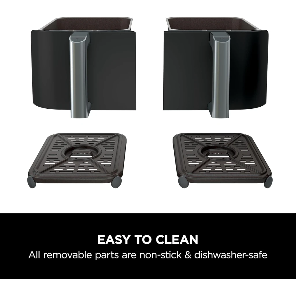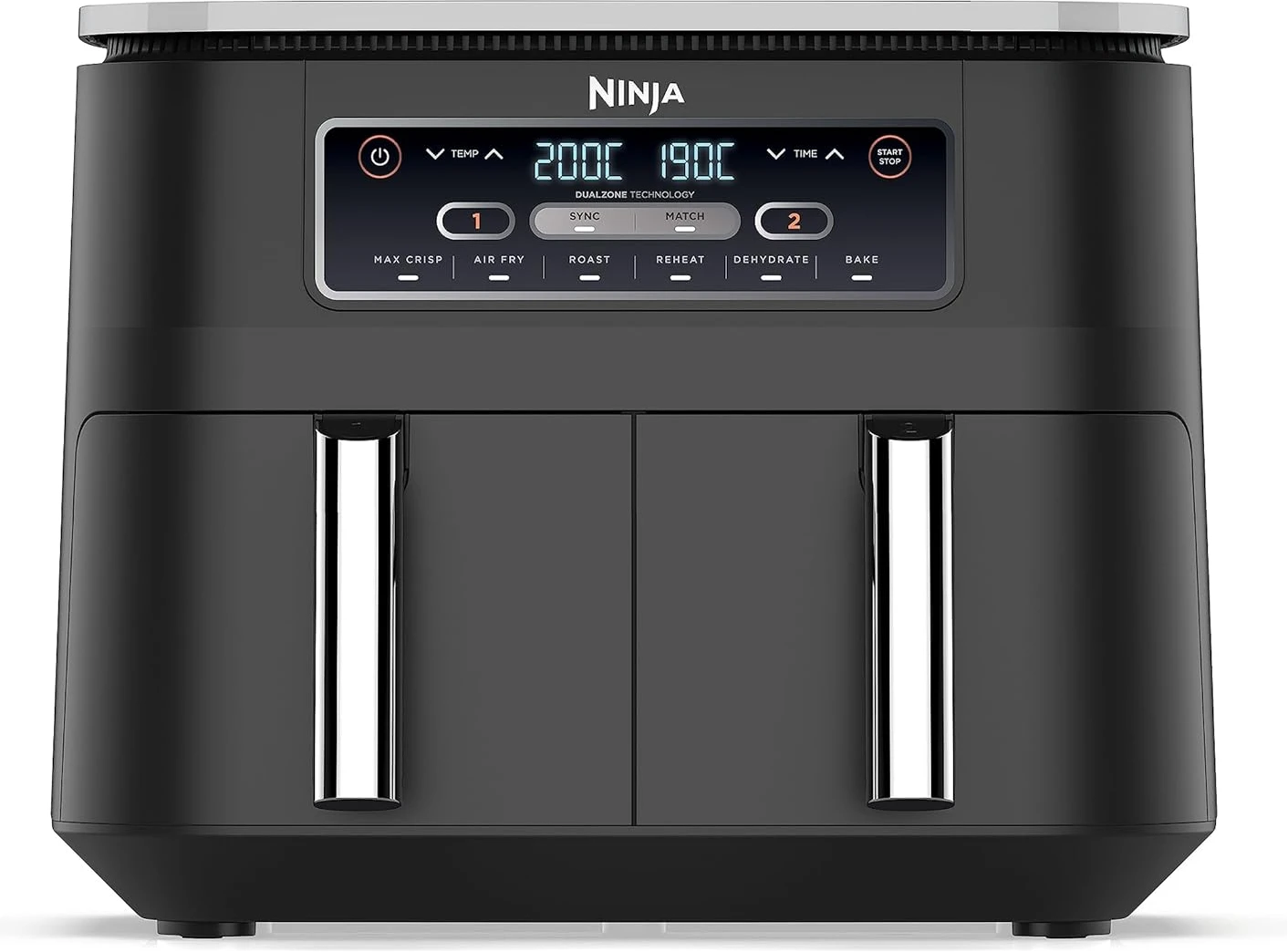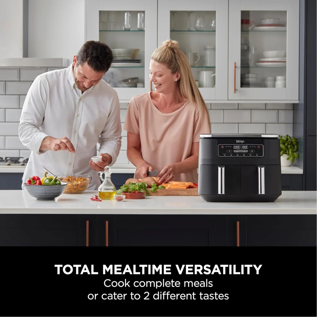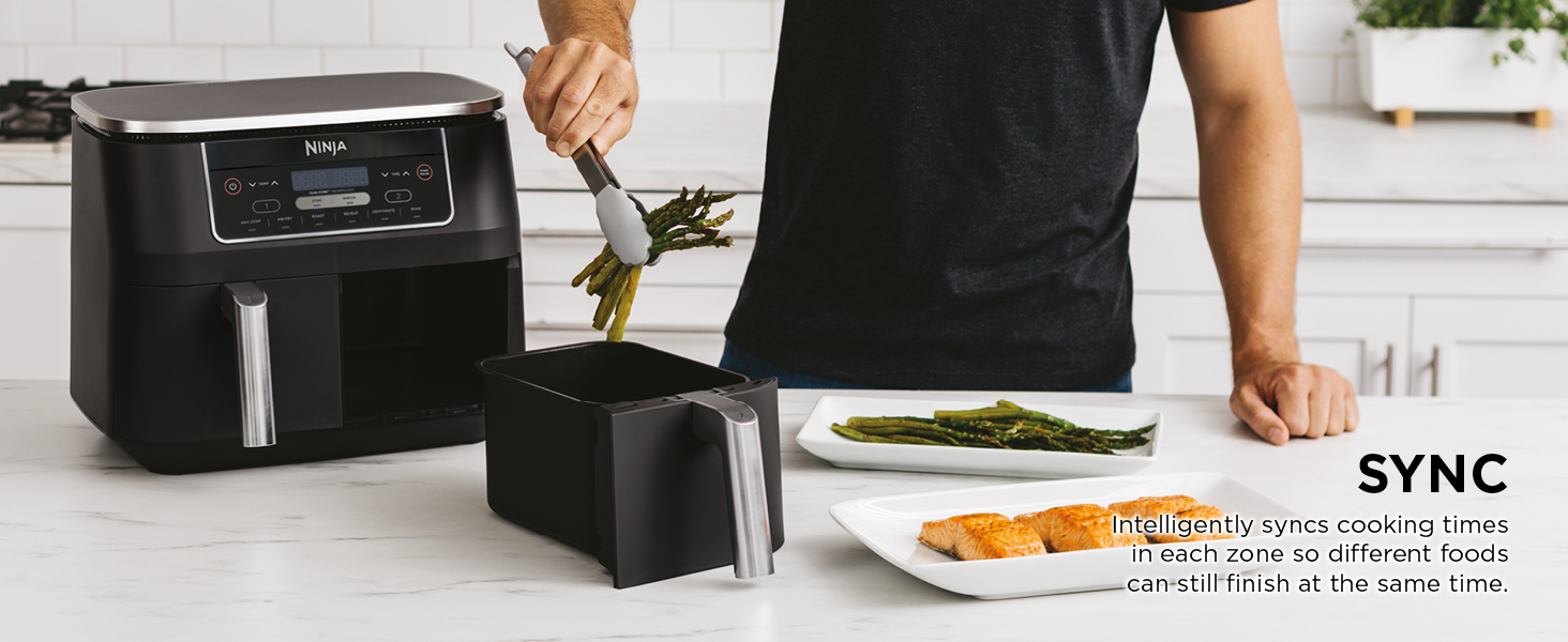 Ninja Foodi 7.6L Dual Zone Digital Air Fryer, 2 Drawers, 6-in-1, Air Fry, Max Crisp, Roast, Bake, Dehydrate, Cooks 4-6 Portions, Non-Stick, Dishwasher Safe Baskets, Black, AF300ME, 2 Years Warranty. Save up to 75% on your oven energy bill. The air fryer that cooks 2 foods, 2 ways, and finishes at the same time. More than an air fryer. 6 ways to cook – Max Crisp, Roast, Bake, Reheat, Dehydrate and Air Fry. When it comes to cooking, timing is everything. The Ninja Foodi Dual Zone 7.6L Air Fryer does the thinking and timing for you. With 2 independent cooking zones, you can mix and match cooking programs, times and temperatures across both drawers to create delicious meals in moments! SYNC to cook different foods in each drawer – both ready to serve at exactly the same time! Feeding the whole household? MATCH to make double the amount of food in the same amount of time! Up to 75% faster than fan ovens, cook from frozen to crispy in minutes. Air Fry using little to no oil – up to 75% less fat. (Testing and calculations based on recommended cook time for sausages, using air fry function versus conventional ovens. Tested against fish fingers and sausages, including pre-heat. Tested against deep fried, hand-cut French fries.)